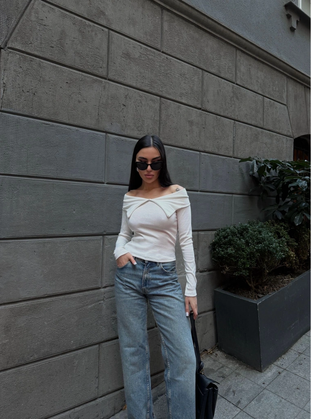 Kelebek yaka uzun kol bluz beyaz, şıklığı ve rahatlığı bir arada sunar.