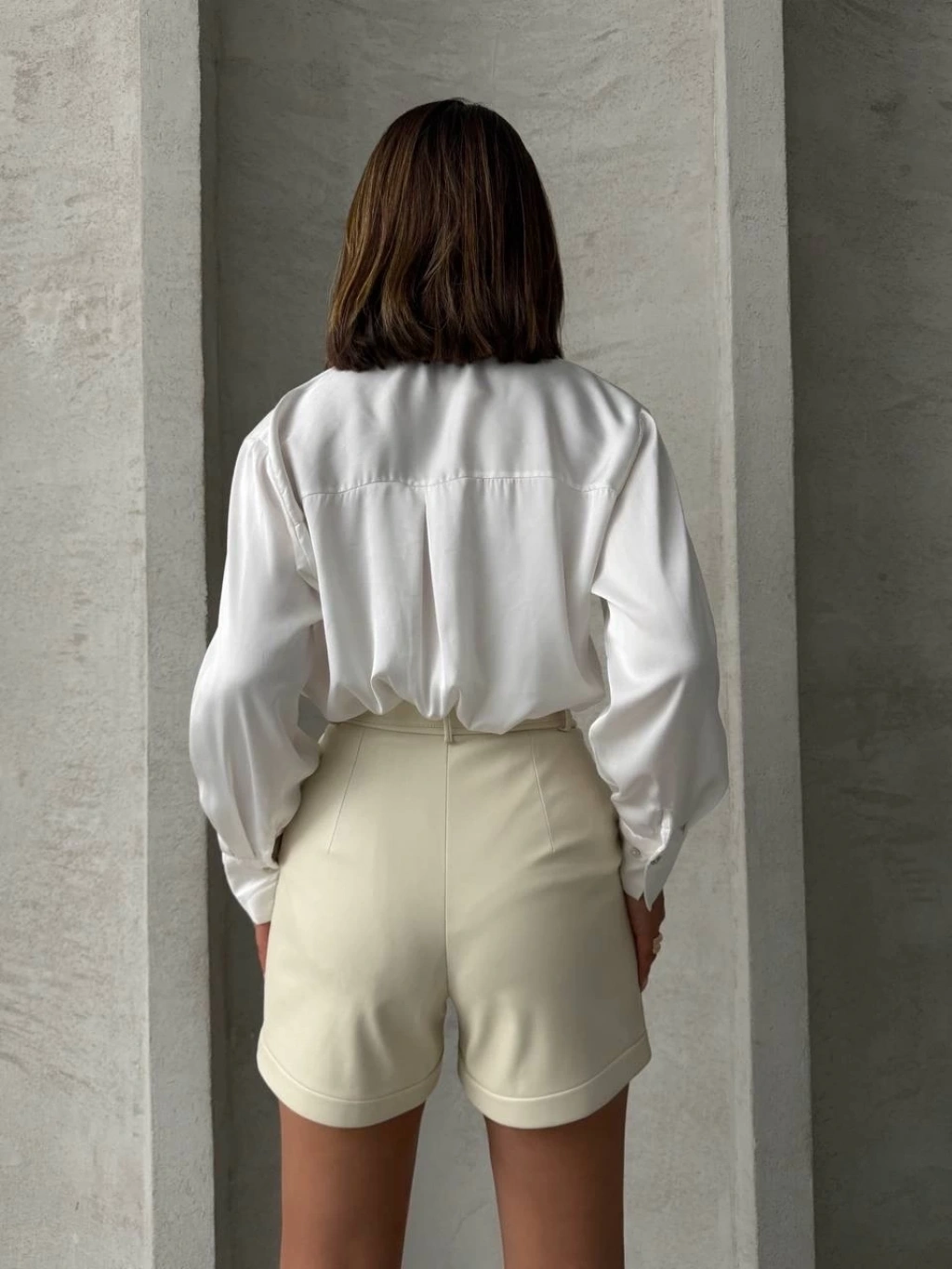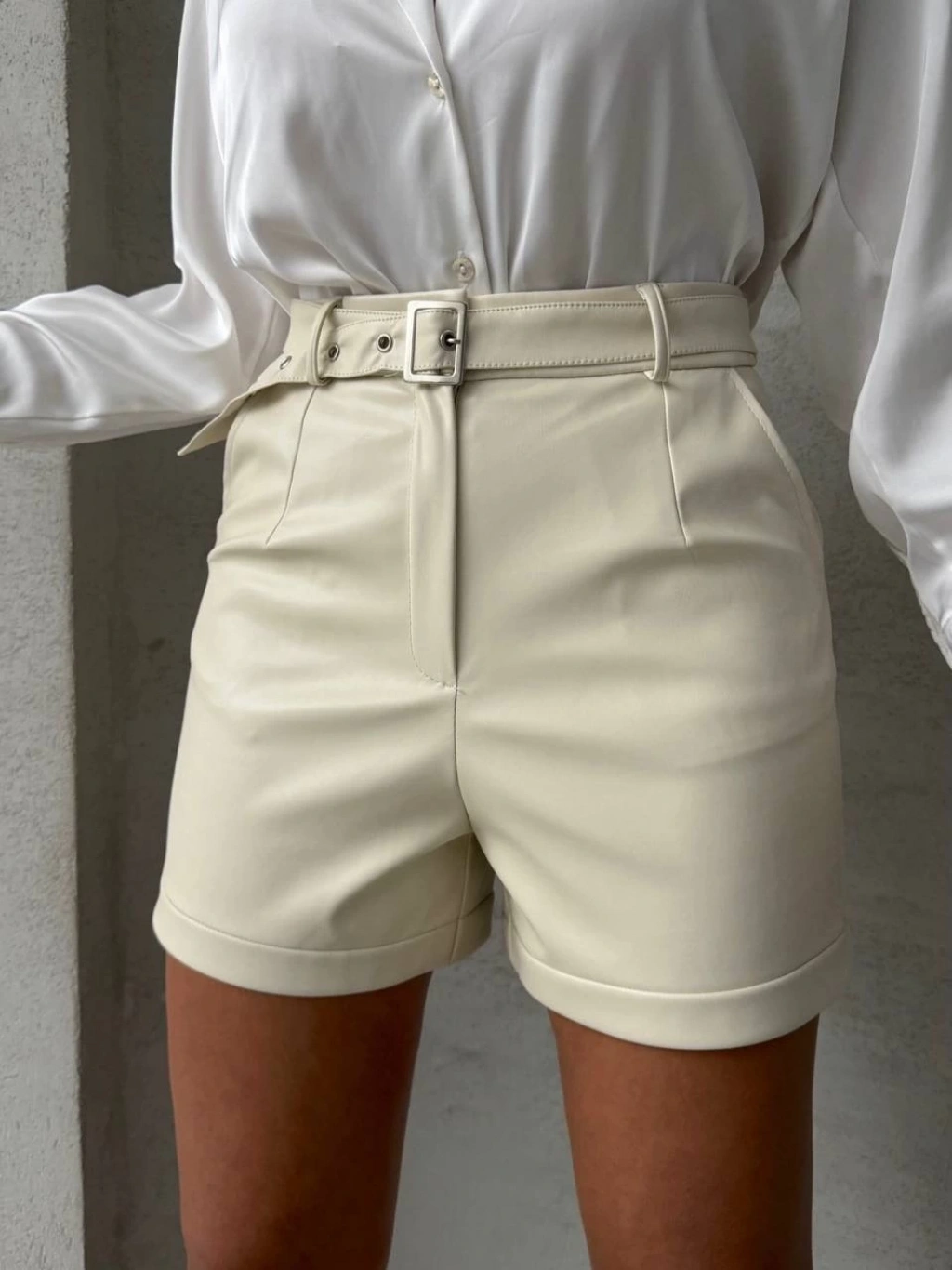 BİÇOMİ Beli lastikli çıtçıtlı deri şort krem w241007