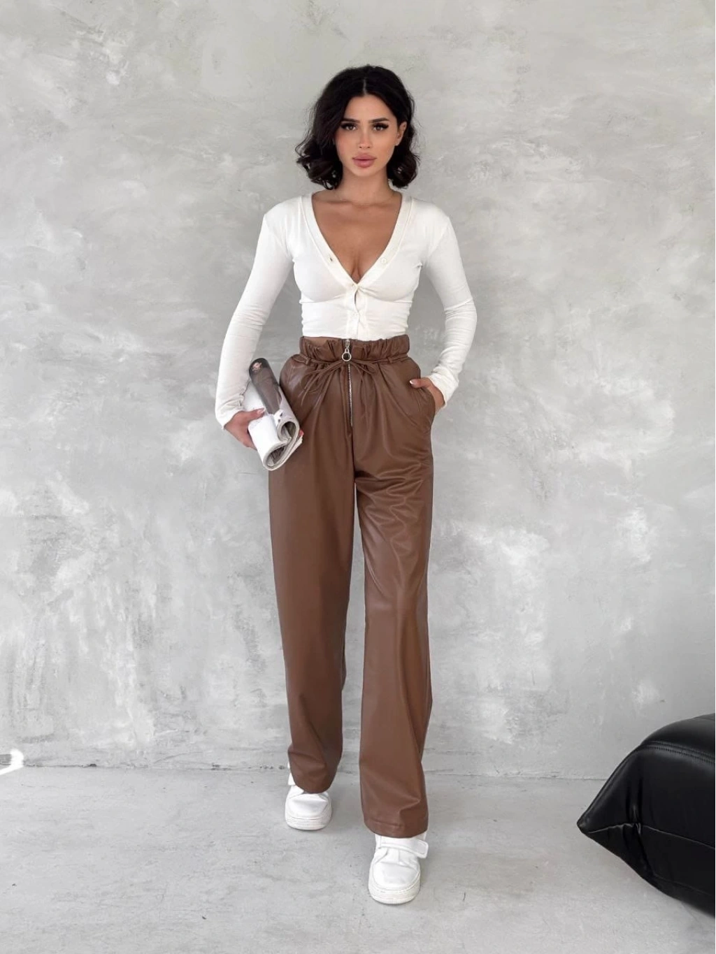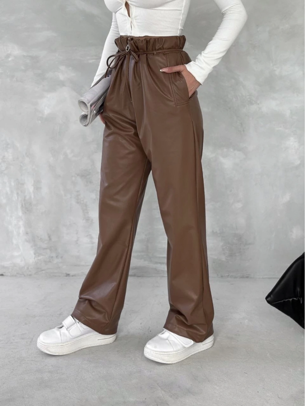 Şıklığı ve rahatlığı bir arada sunan Kendinden İnce Kemerli Deri Pantolon Kahve T1178, gardırobunuzun vazgeçilmezi olmaya aday! İnce bel kısmı sayesinde vücudu saran ve belinizi ön plana çıkaran bu pantolon, deri dokusuyla da şıklığına şıklık katıyor.
