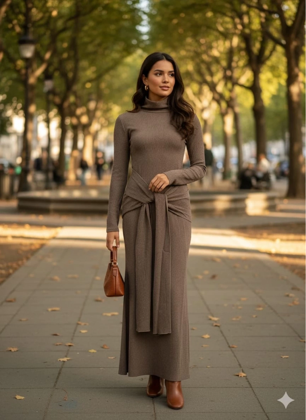 Bu vizon renkli uzun elbise, şıklığı ve rahatlığı bir arada sunuyor. Kendinden kemer detayı sayesinde belinizi ön plana çıkarırken, salaş kesimiyle de hareket özgürlüğü sağlar. İster günlük kullanım için ister özel davetlerde tercih edin, her ortama uyum sağlayacak şık bir seçenektir.