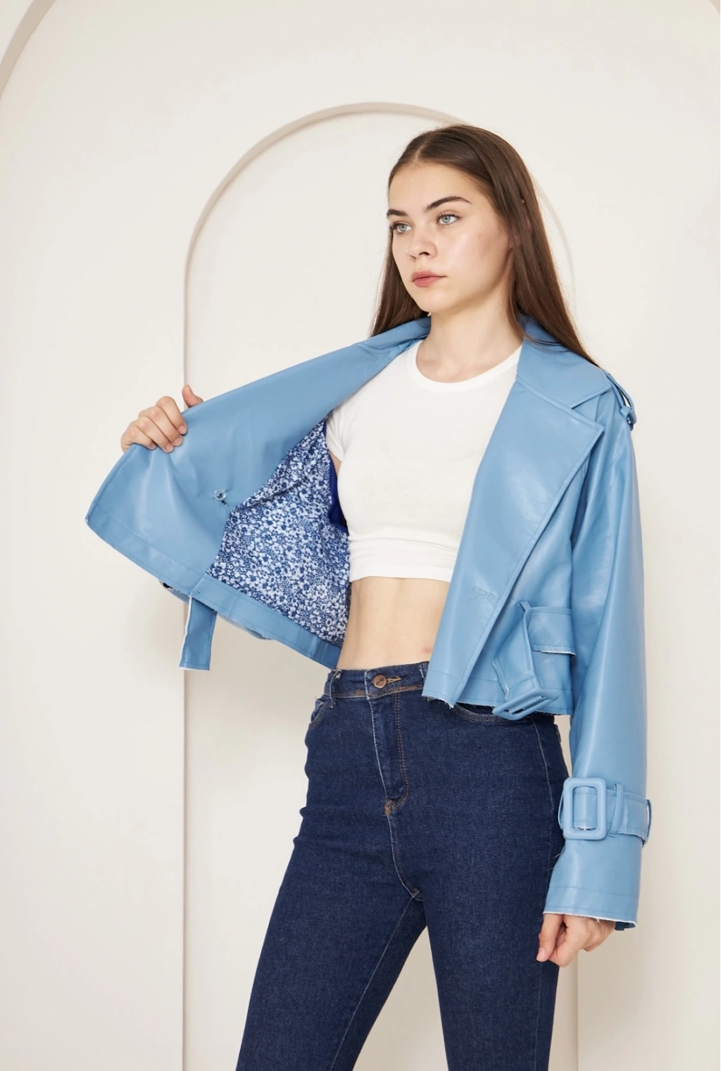 BİÇOMİ Çift cepli kol katlamalı kar yıkama crop kot ceket buz mavi d2000
