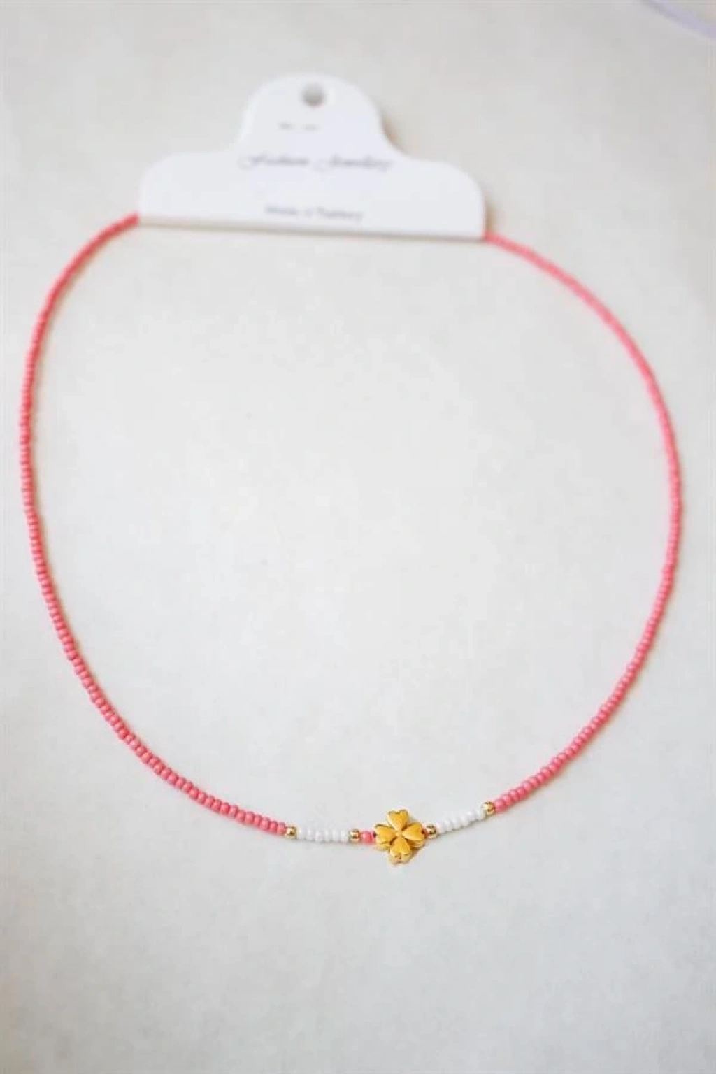 biçomi Kum Boncuklu Yonca Kolye - Nar Çiçeği