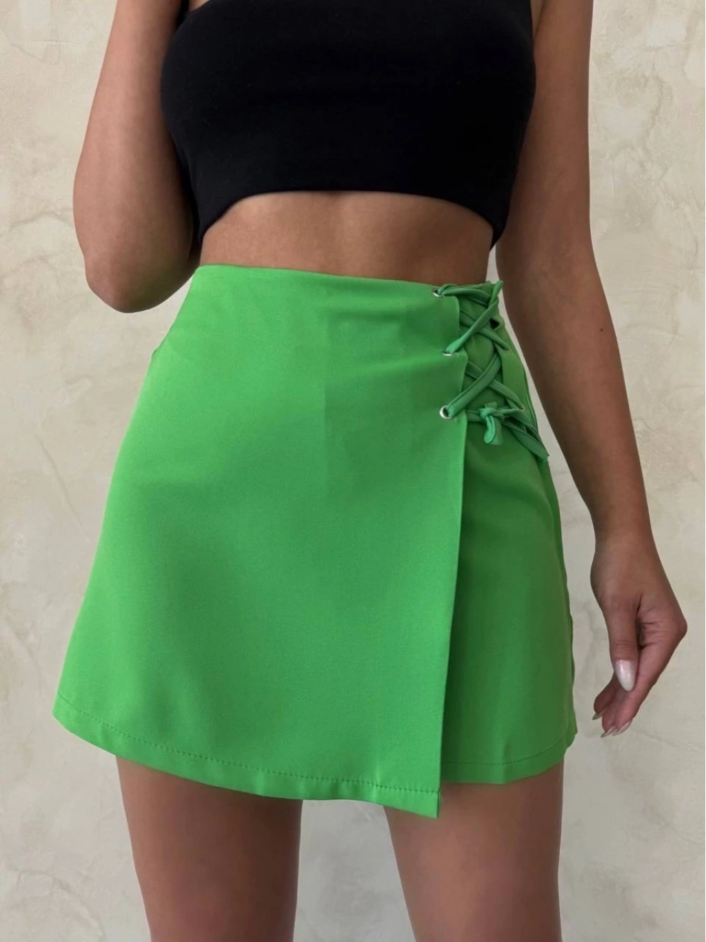 Şık yeşil rengi, yaz aylarında sizi ferah ve stil sahibi gösterecek. Yazın vazgeçilmezi olan şort etek, her kombinle rahatlıkla uyum sağlar.