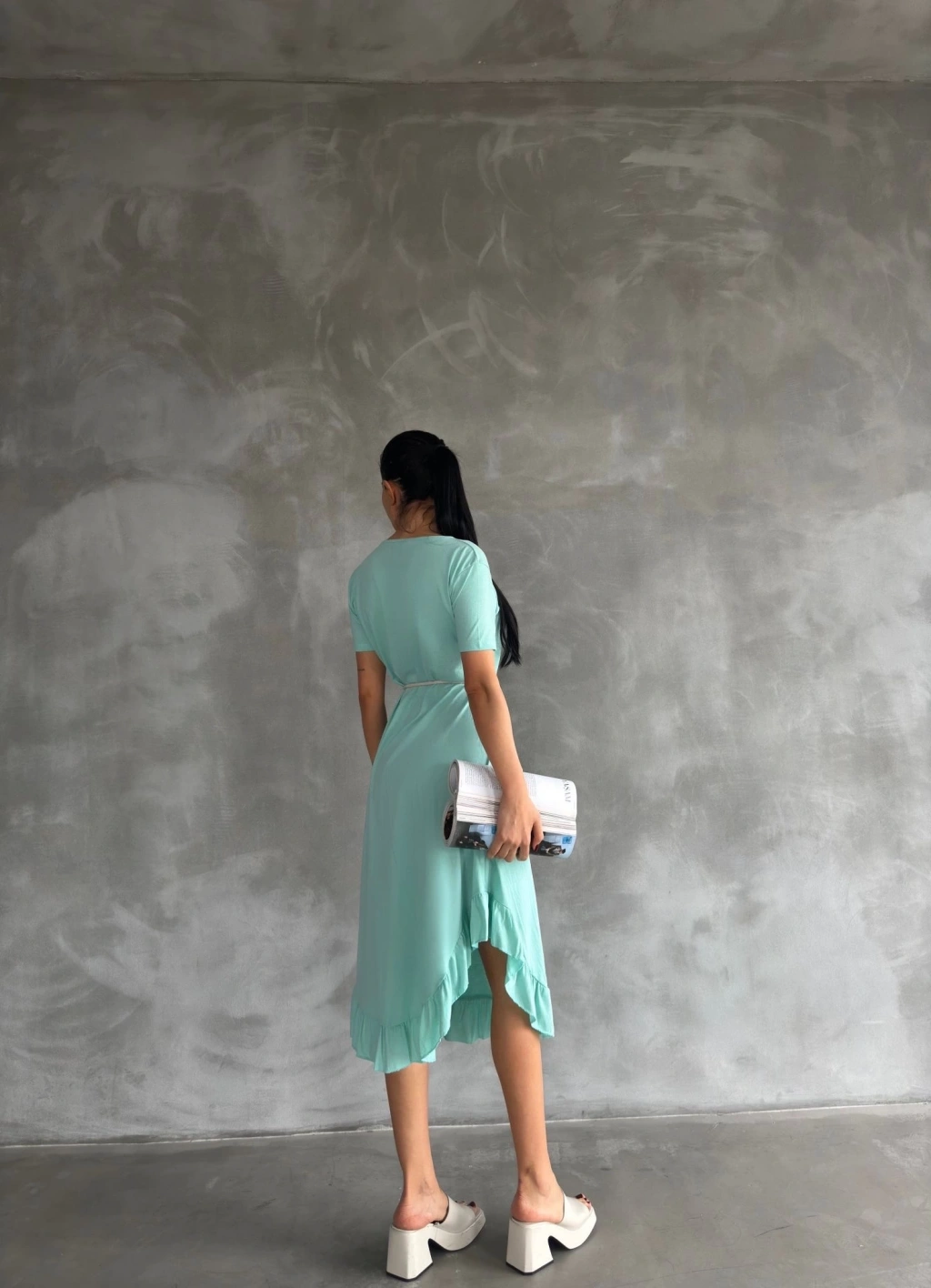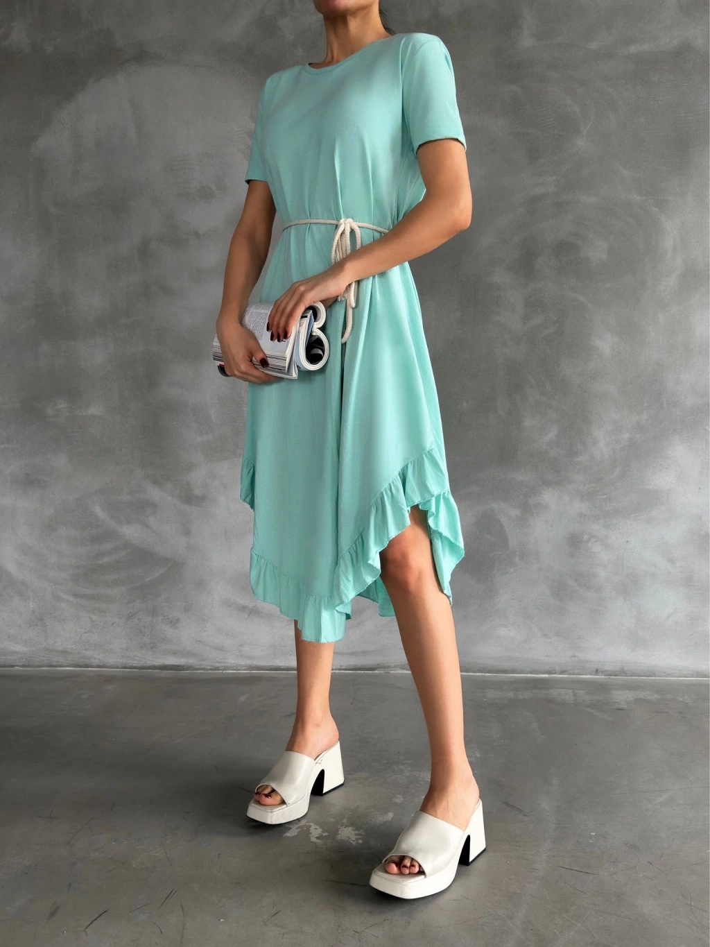• Bel kısmında yer alan kuşak detayı, vücuda oturarak feminen bir görünüm sağlar.