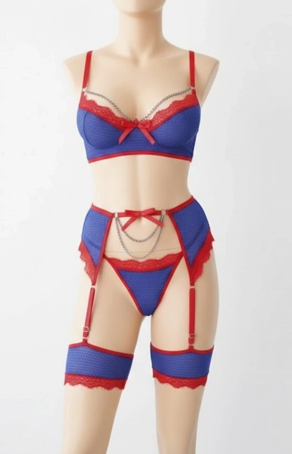 Bicomi Mavi Kırmızı Zincir Detaylı Fantezi Sütyen Külot Jartiyer Takım