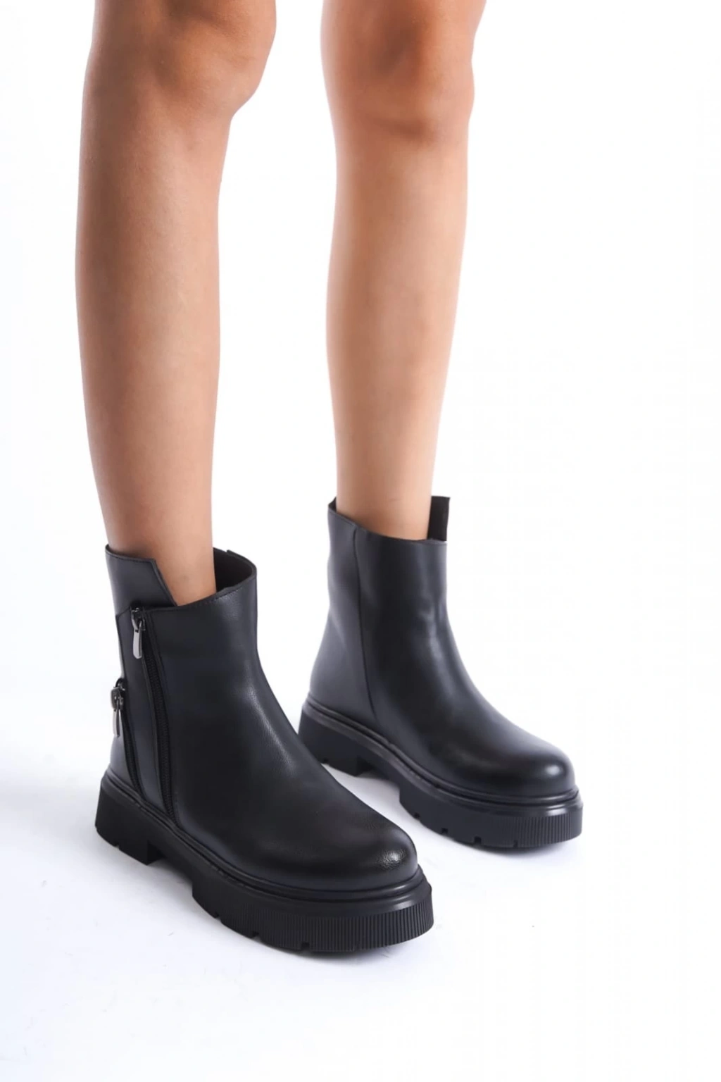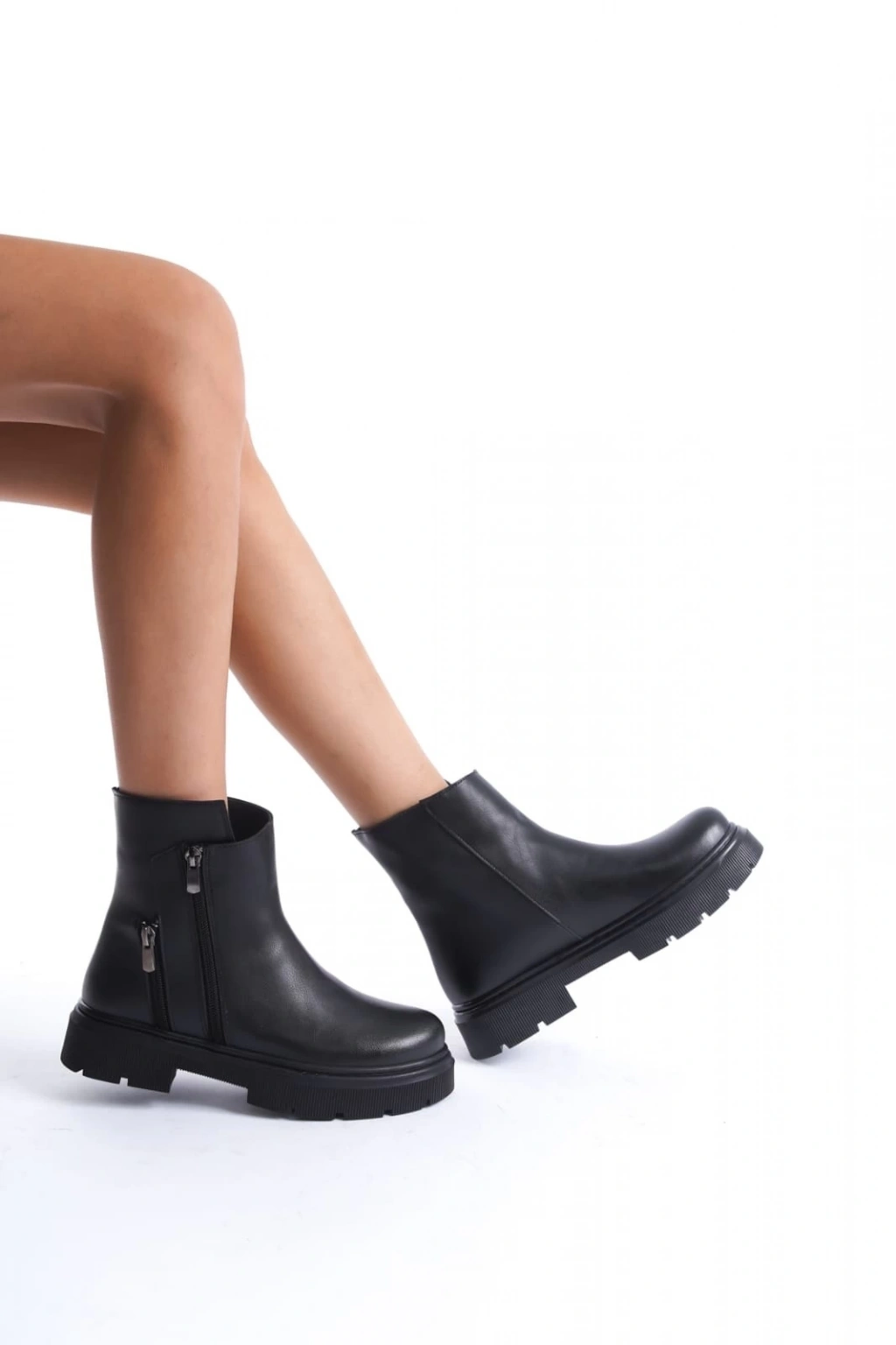 BİÇOMİ Menta Siyah Cilt Fermuar Aksesuarlı Bot