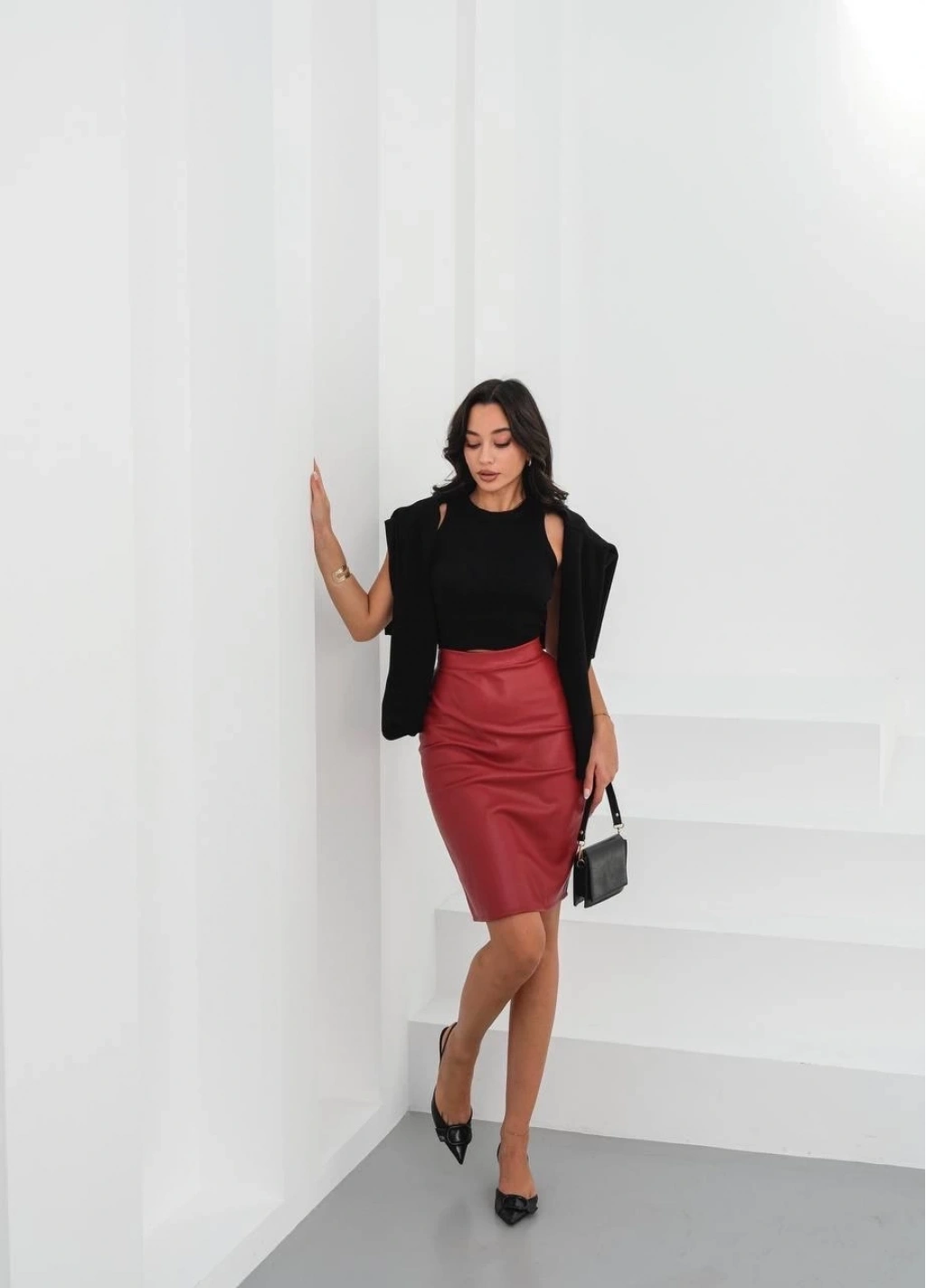 Bu bordo midi boy kalem etek, gardırobunuza şıklık katacak bir parça. Hem günlük hayatta hem de özel günlerde rahatlıkla tercih edebileceğiniz bu etek, şık ve feminen bir görünüm sağlar. İnce bel detayı sayesinde vücut hatlarınıza uyum sağlayarak sizi daha zarif gösterir.