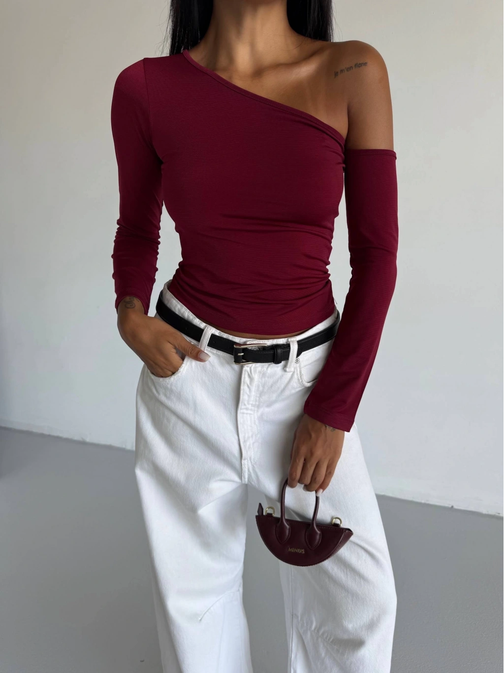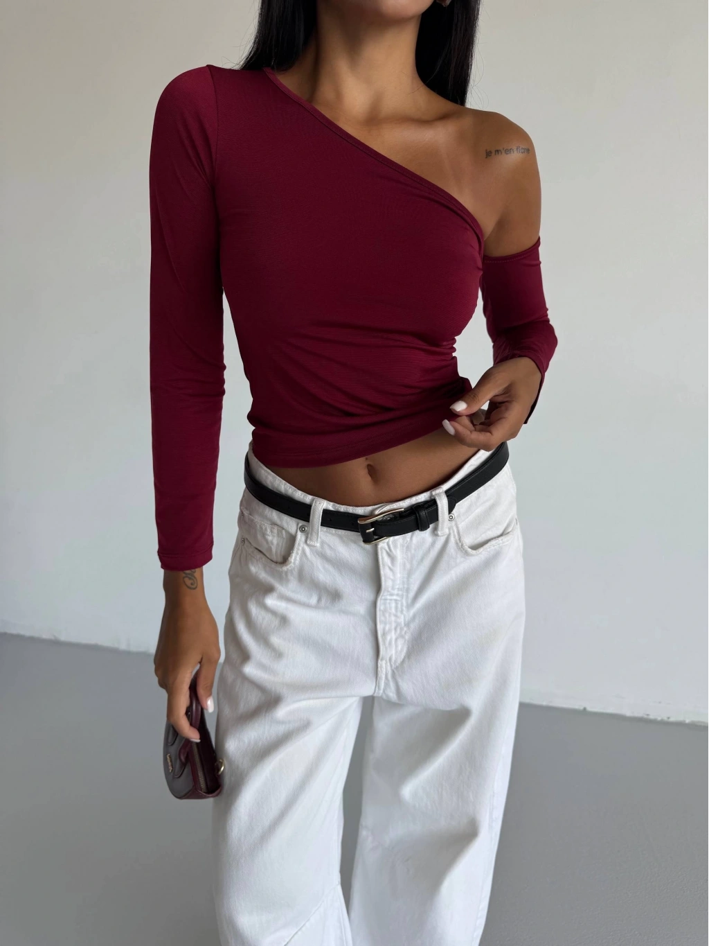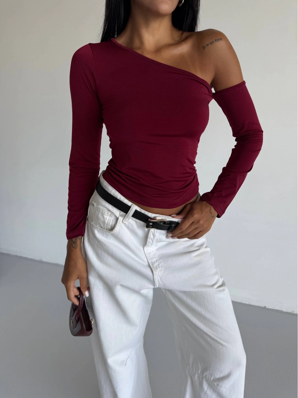 Omuz detaylı kollu bluz bordo F2336, trendy ve şık bir görünüm sunar.
