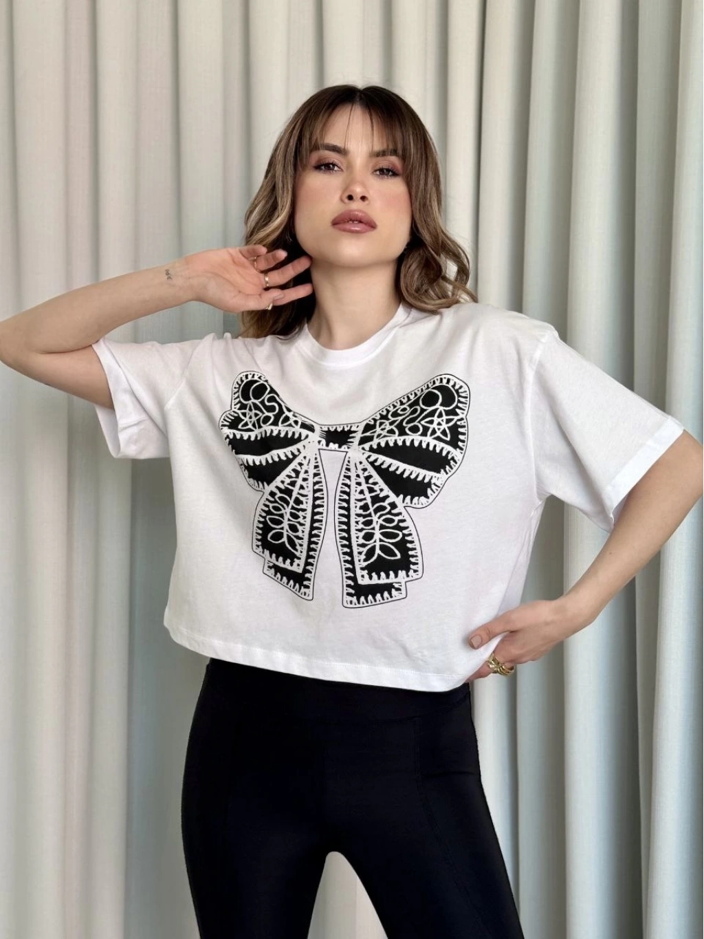 BİÇOMİ Oversize Beyaz baskılı crop tişört