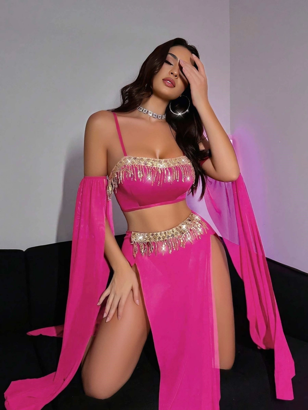 Canlı pembe rengi ve dikkat çekici detaylarıyla tasarlanan bu özel dansöz kostümü, sahne şıklığını ve feminen cazibeyi bir araya getirir. Vücuda oturan kesimi sayesinde hareketleri zarifçe ön plana çıkarırken, özel tasarım detayları kostüme göz alıcı bir görünüm kazandırır. Hafif ve esnek yapısı sayesinde rahat hareket imkânı sunar. Gösteriler, özel etkinlikler ve konsept kombinler için ideal bir tercihtir.