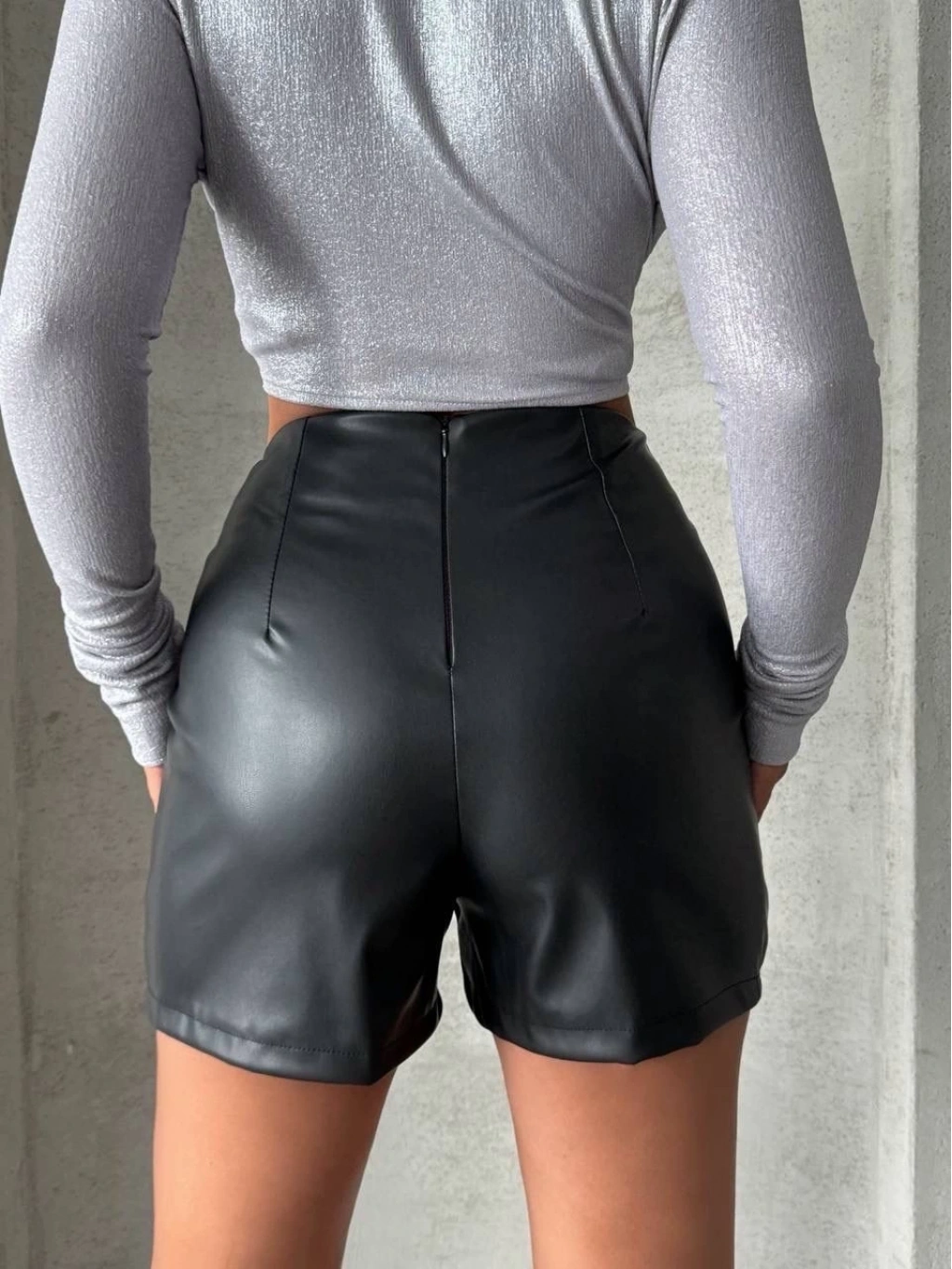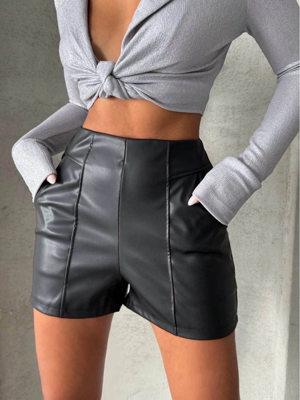 Bu şık ve şıklık arayan kadınlar için ideal olan siyah deri şort, gardırobunuzun vazgeçilmezi olmaya aday. Parçalı cepli tasarımı ile hem şık hem de kullanışlı bir görünüm sunar.