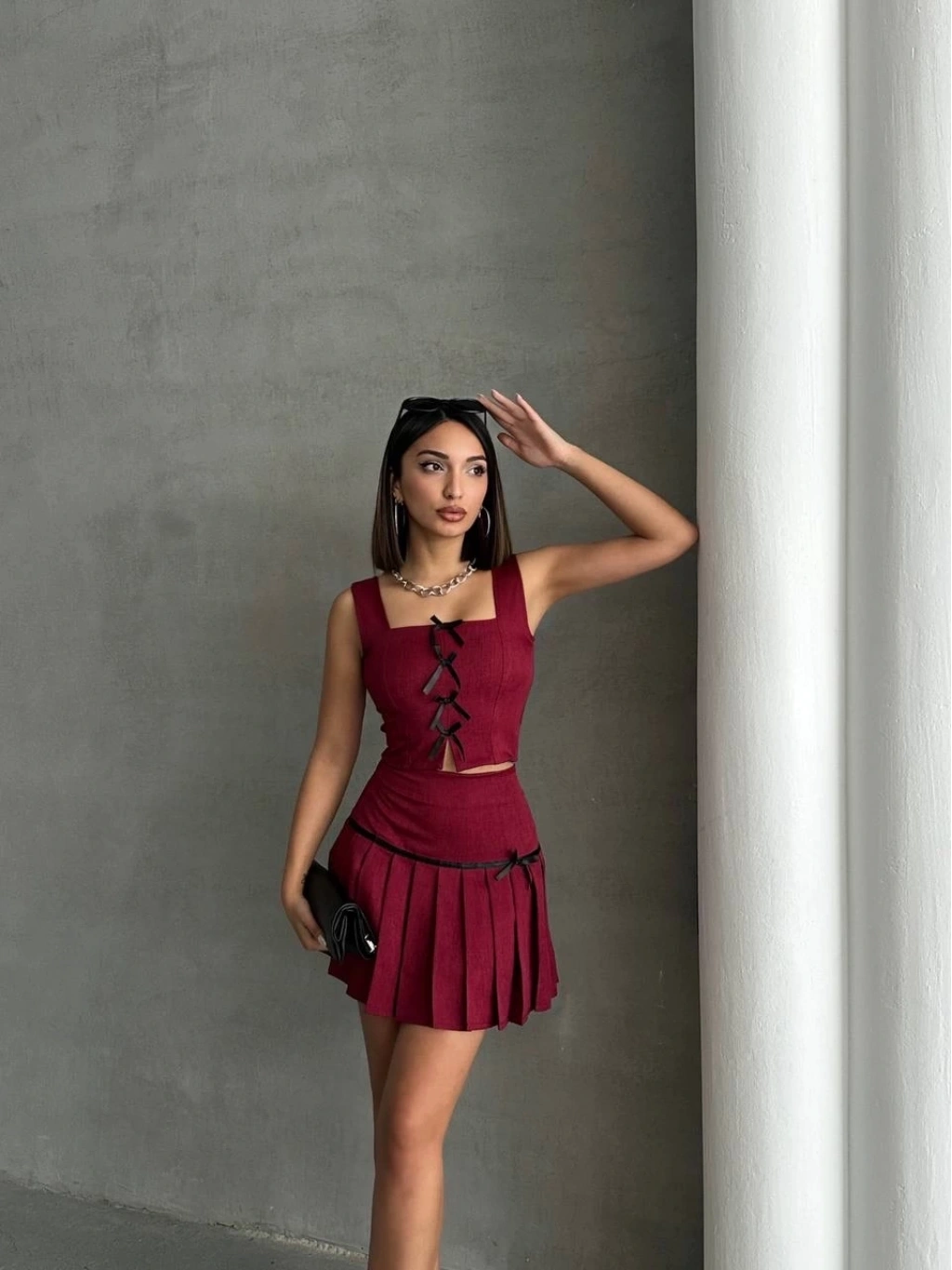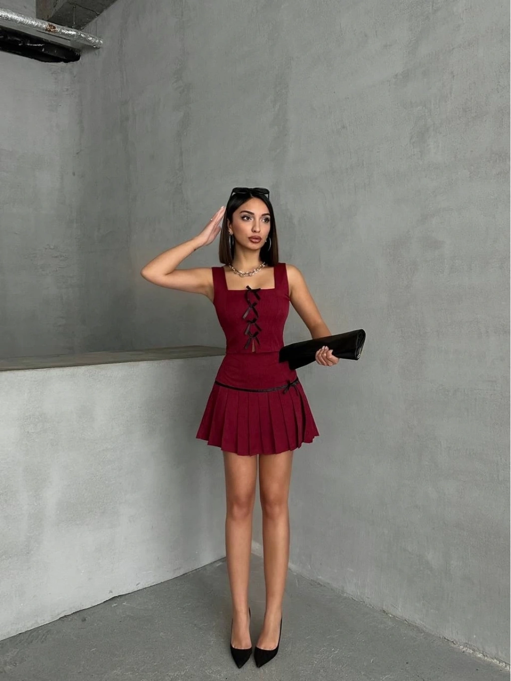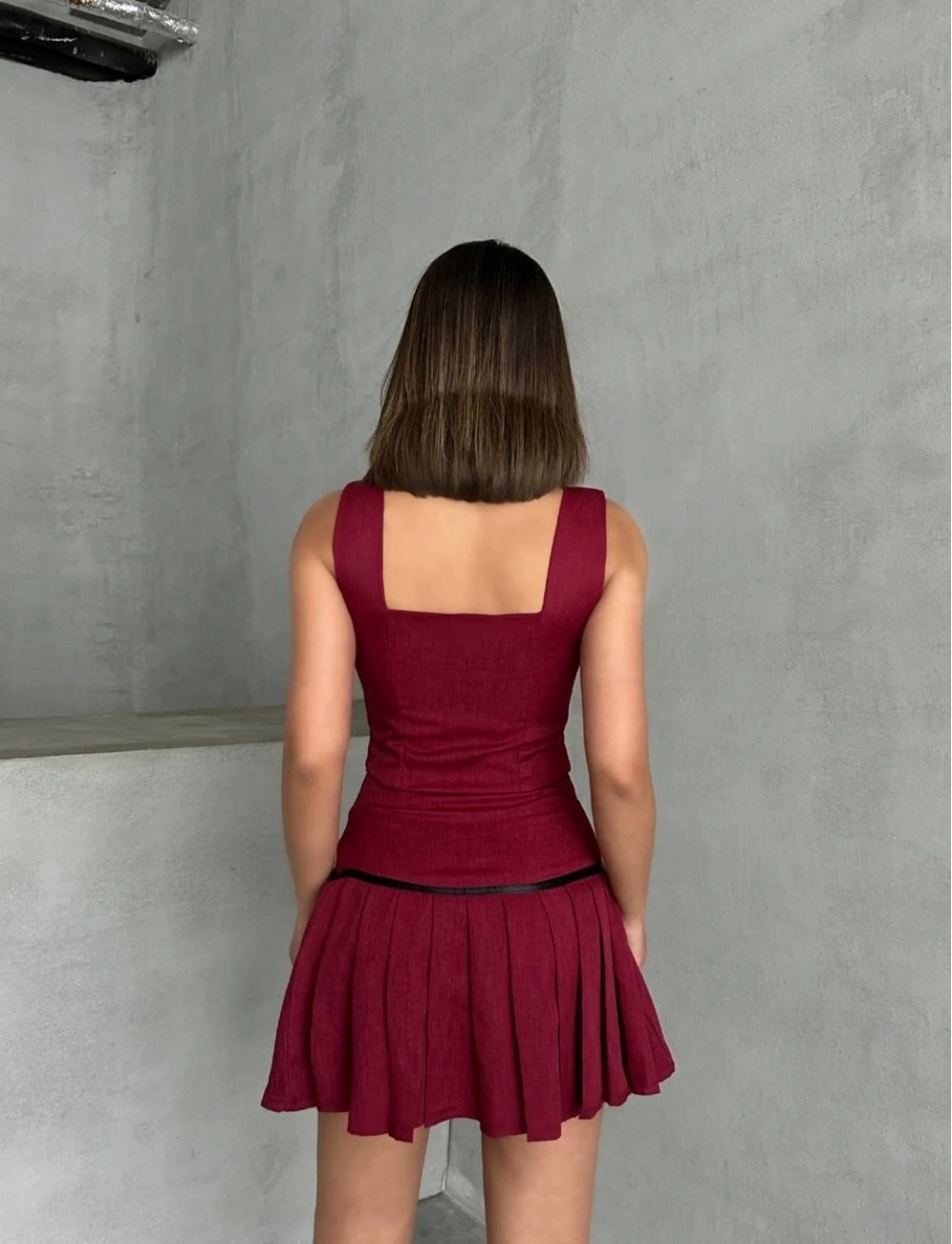 Pileli etek yelek takım bordo S255015, gardırobunuzun vazgeçilmezi olmaya aday!