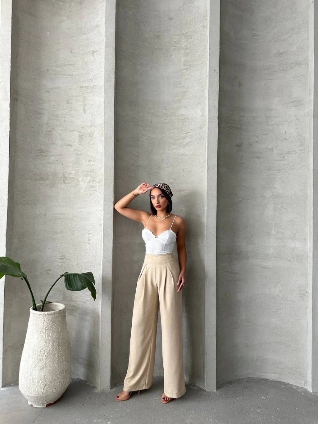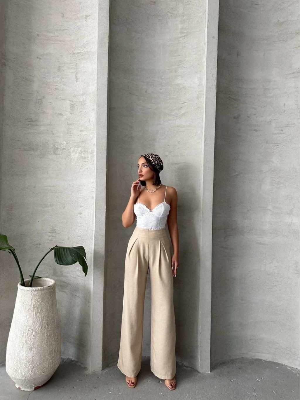 Pileli keten pantolon, yaz aylarında şıklık ve rahatlık arayan kadınların tercihi olacak
