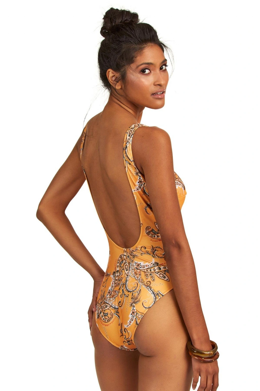 İnce sünger kaplı, yuvarlak yaka sırtı açık mayo.