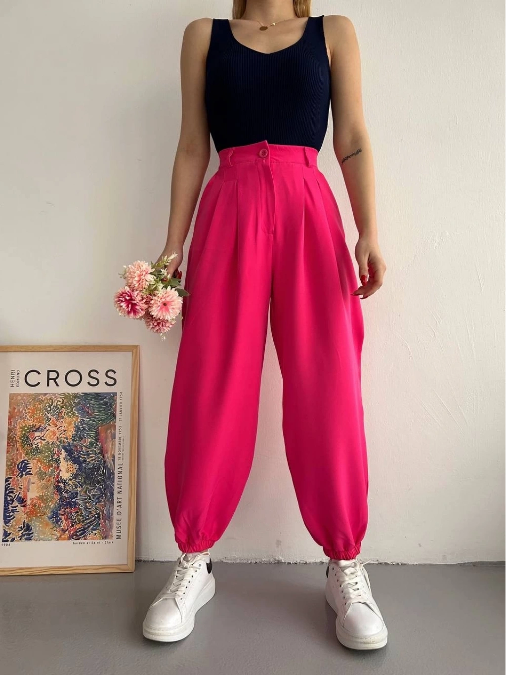 - Fuşya rengi ile dikkat çeken pantolon, kombinlerinize enerjik bir hava katacaktır.