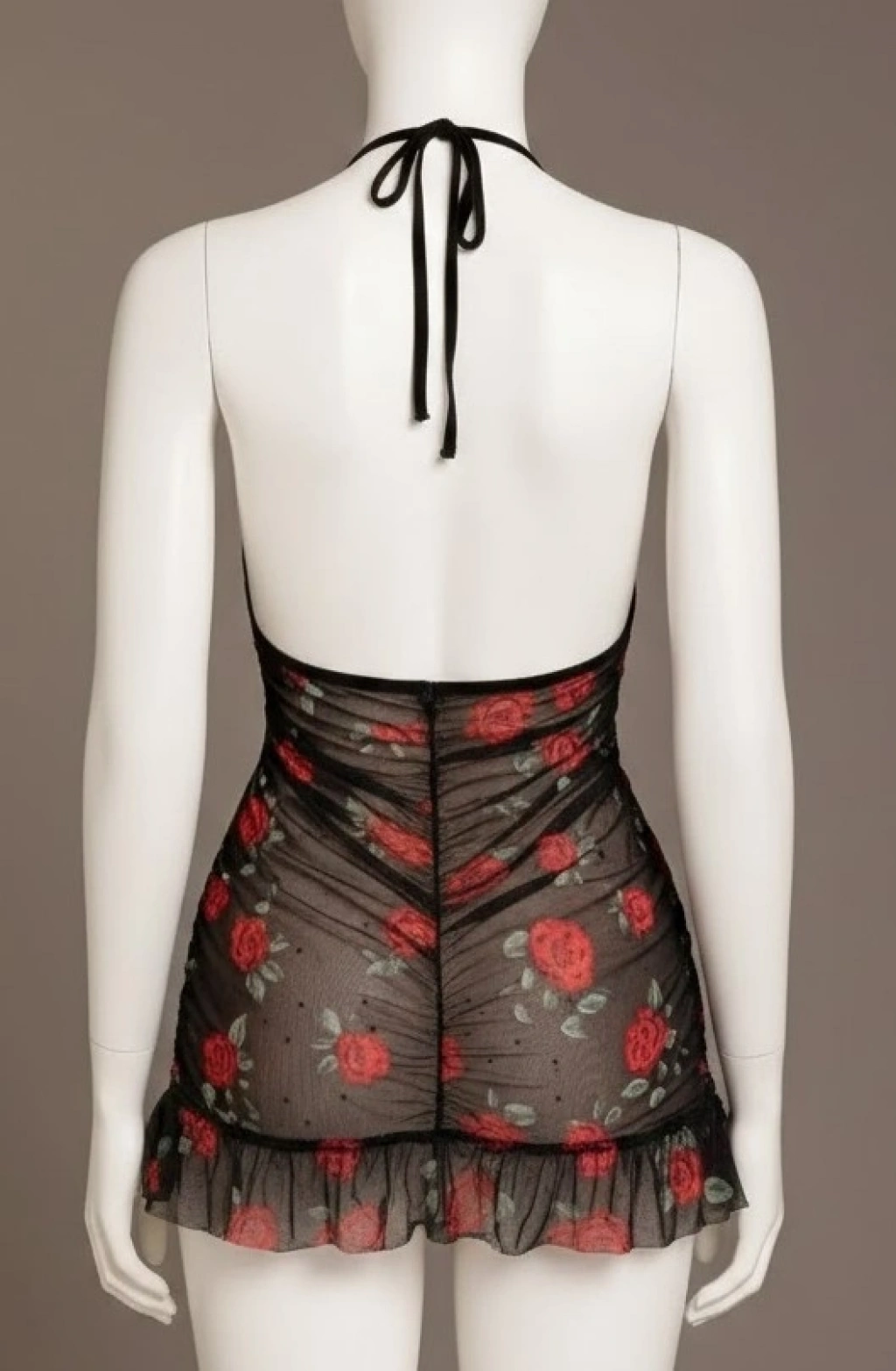 Bicomi Siyah Dantel İşlemeli Gül Desenli Mini Fantezi Gecelik