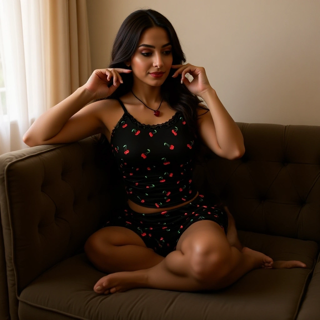 Şıklığın zarafetle, masumiyetin hafif çekicilikle buluştuğu bu özel tasarım; Siyah Üstüne Kiraz Desenli Dantel İşlemeli Askılı Şortlu Pijama Takımı, feminen detaylarıyla hem rahatlığı hem de estetik görünümü ön plana çıkarıyor. Kiraz desenlerinin tatlı enerjisi, siyahın asaletini tamamlayarak gecelerinize neşeli ve romantik bir hava katıyor.