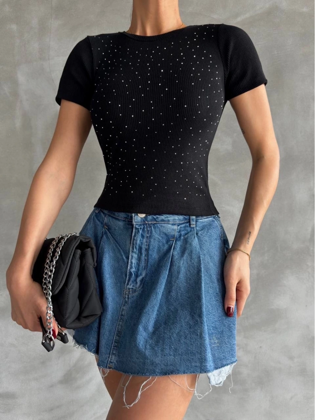 Şıklığı ve konforu bir arada arayan kadınlar için ideal bir tercih olan KAZAX taş baskılı kaş korse bluz, gardırobunuzun vazgeçilmez parçalarından biri olmaya aday!