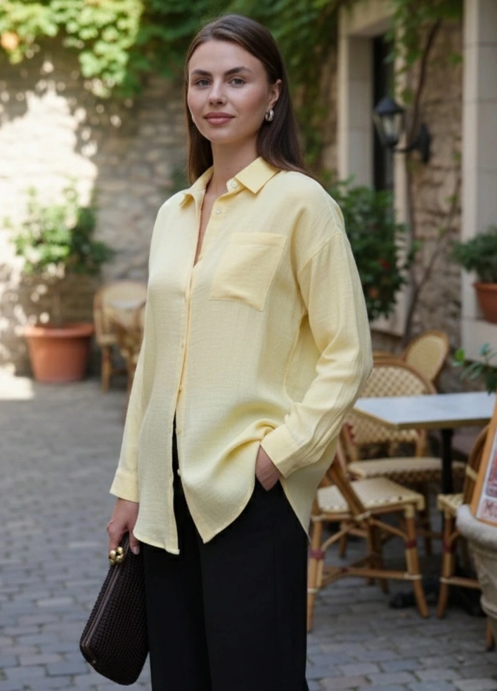 - Sarı rengiyle dikkat çeken gömlek, yaz aylarında ferah ve şık bir görünüm sunar.