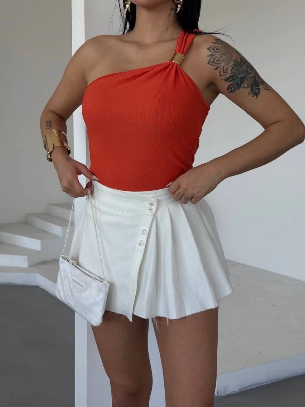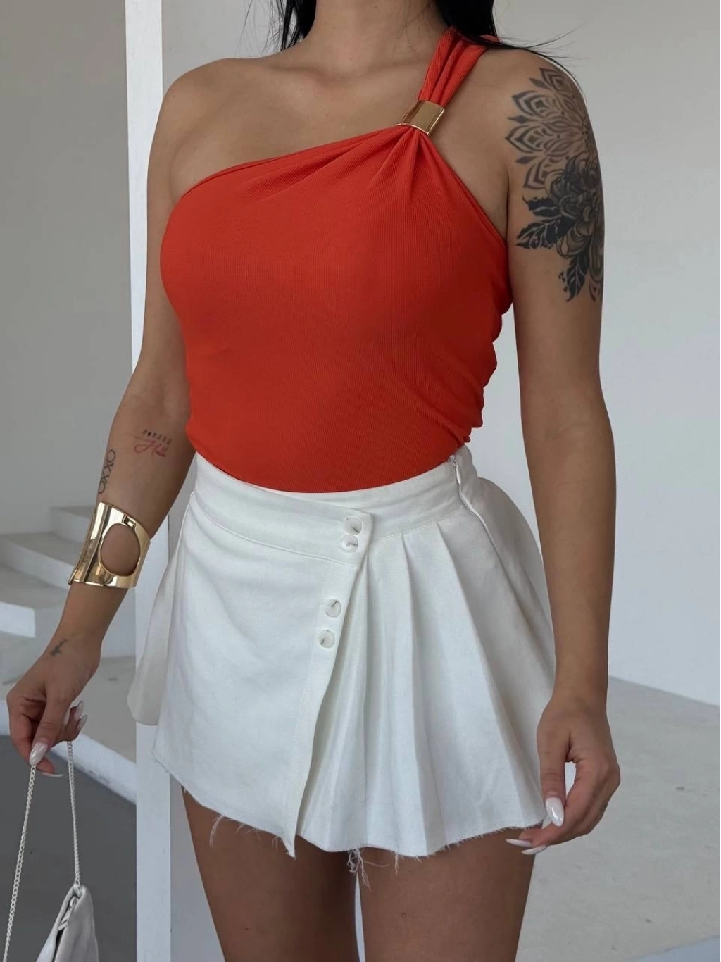 Şıklığı ve zarafeti bir arada sunan Tek Omuzlu Otoman Kumaş Gold Metal Detaylı Bluz, gardırobunuzun vazgeçilmez parçalarından biri olmaya aday.