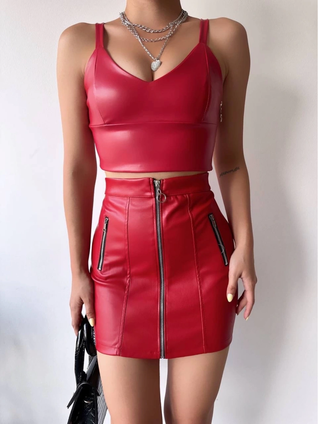 Üç fermuarlı deri etek bordo S24510, şık ve modern bir görünüm elde etmek isteyen kadınların tercihi olacaktır. Gardırobunuzun vazgeçilmez parçalarından biri olmaya aday!