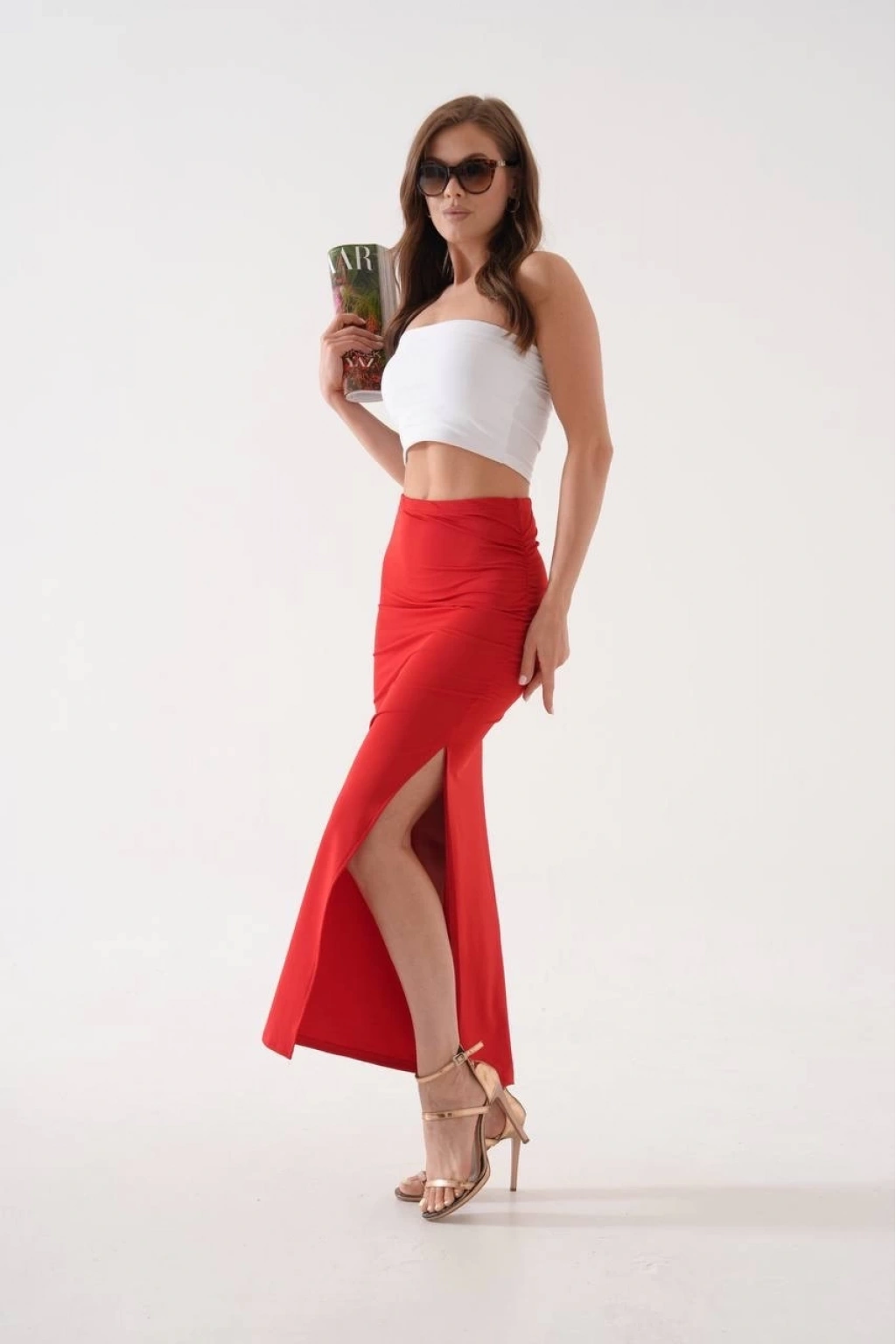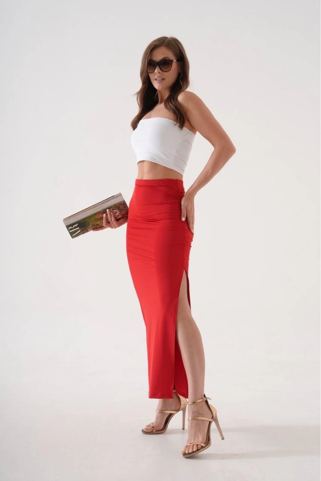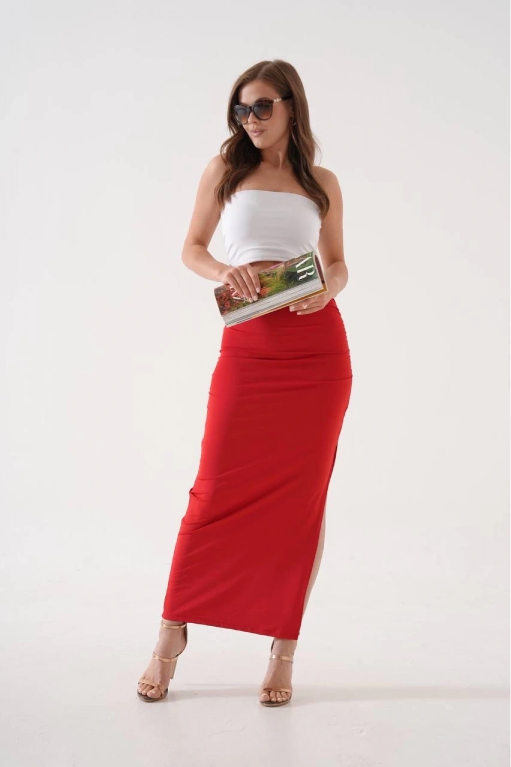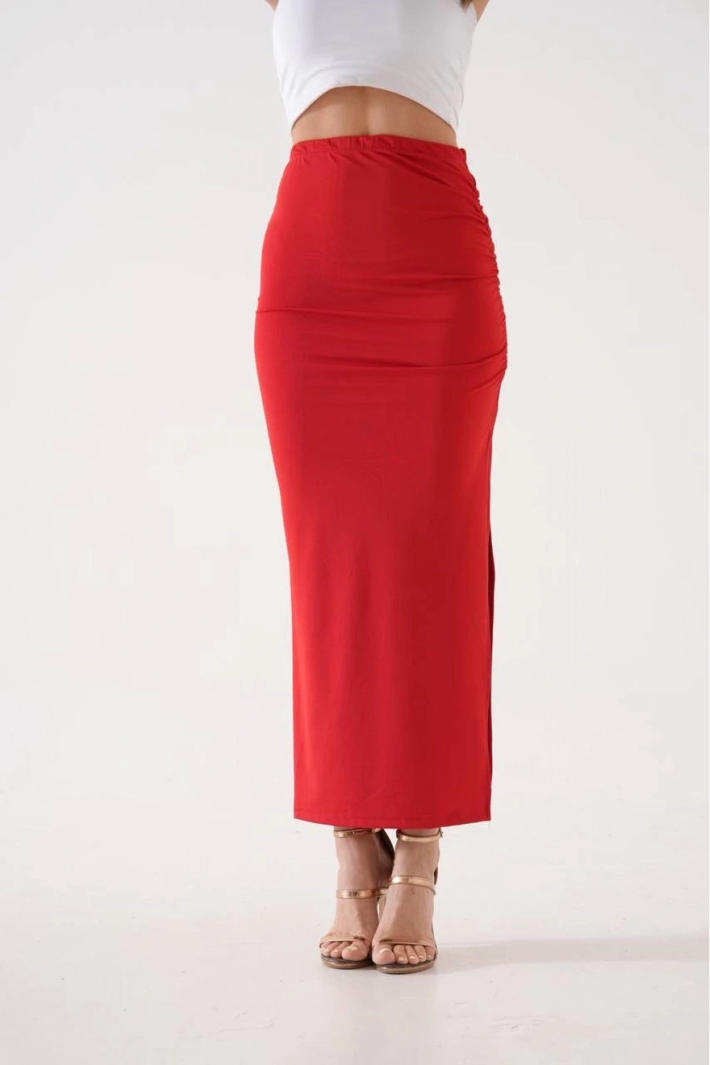 BİÇOMİ Uzun yırtmaçlı ince kumaş etek kırmızı