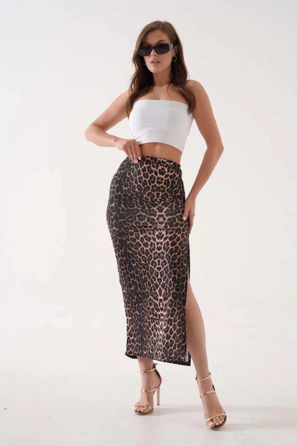 Uzun yırtmaçlı ince kumaş etek, şıklığı ve modernliği bir araya getiriyor. Leopar desenli tasarımıyla dikkat çeken bu etek, iddialı ve trend bir görünüm sunuyor.