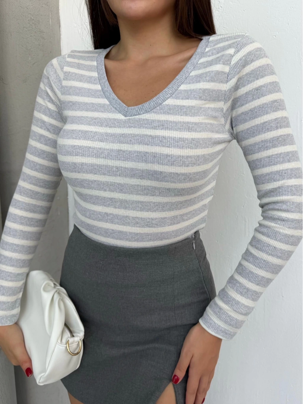 Bu sezonun trendlerine uygun V yaka çizgili bluz gri A3699, şıklığı ve rahatlığı bir arada sunuyor.