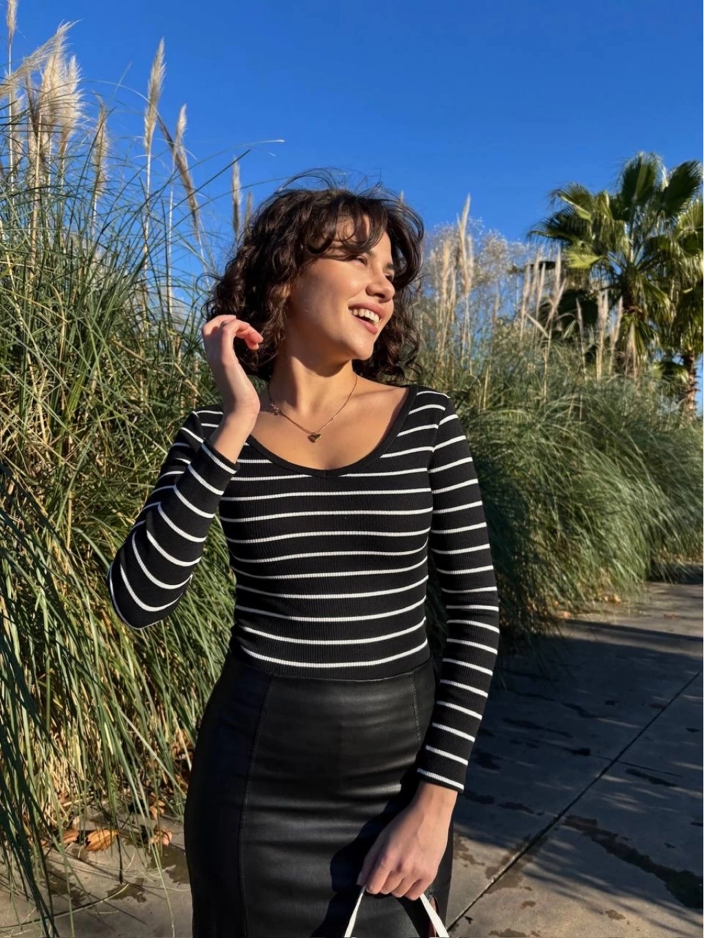 BİÇOMİ V yaka çizgili bluz siyah A3699