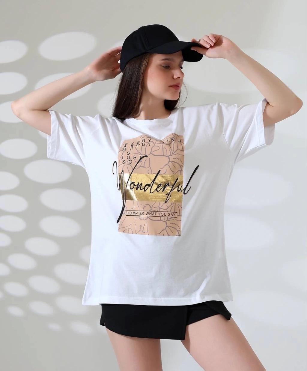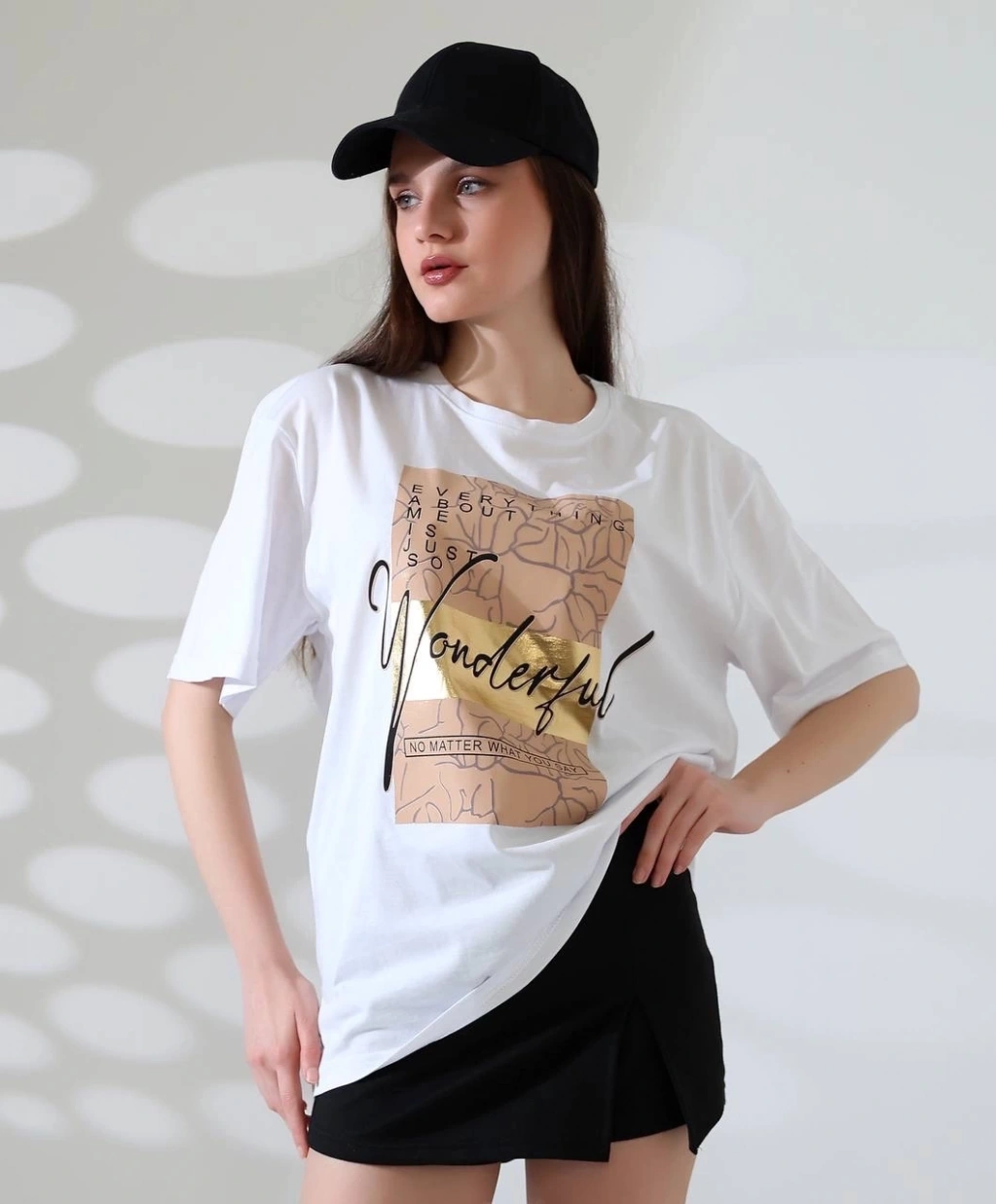 Özel varak baskı tekniği ile tasarlanmış olan bu tişört, hem göz alıcı hem de şık bir görünüm sunmaktadır.