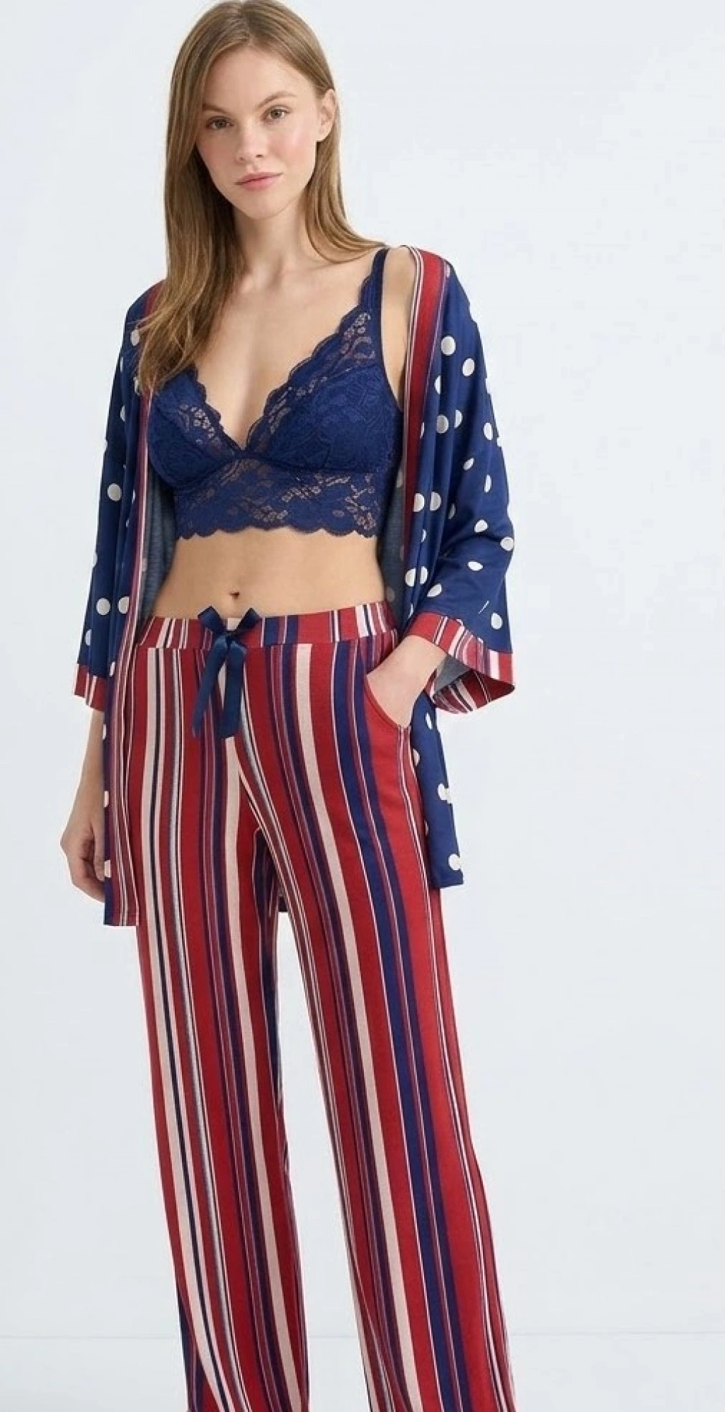 4. Desenlerin Uyumu (Puantiye & Çizgi): Klasik puantiye deseni ile modern çizgili pantolonun bir araya gelmesi, ürüne dinamik ve genç bir hava katar. "Mix & Match" (Karıştır ve Eşleştir) modasına uygun bu tasarım, ev stilinizi sıradanlıktan kurtarır.