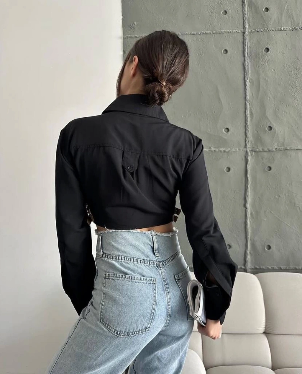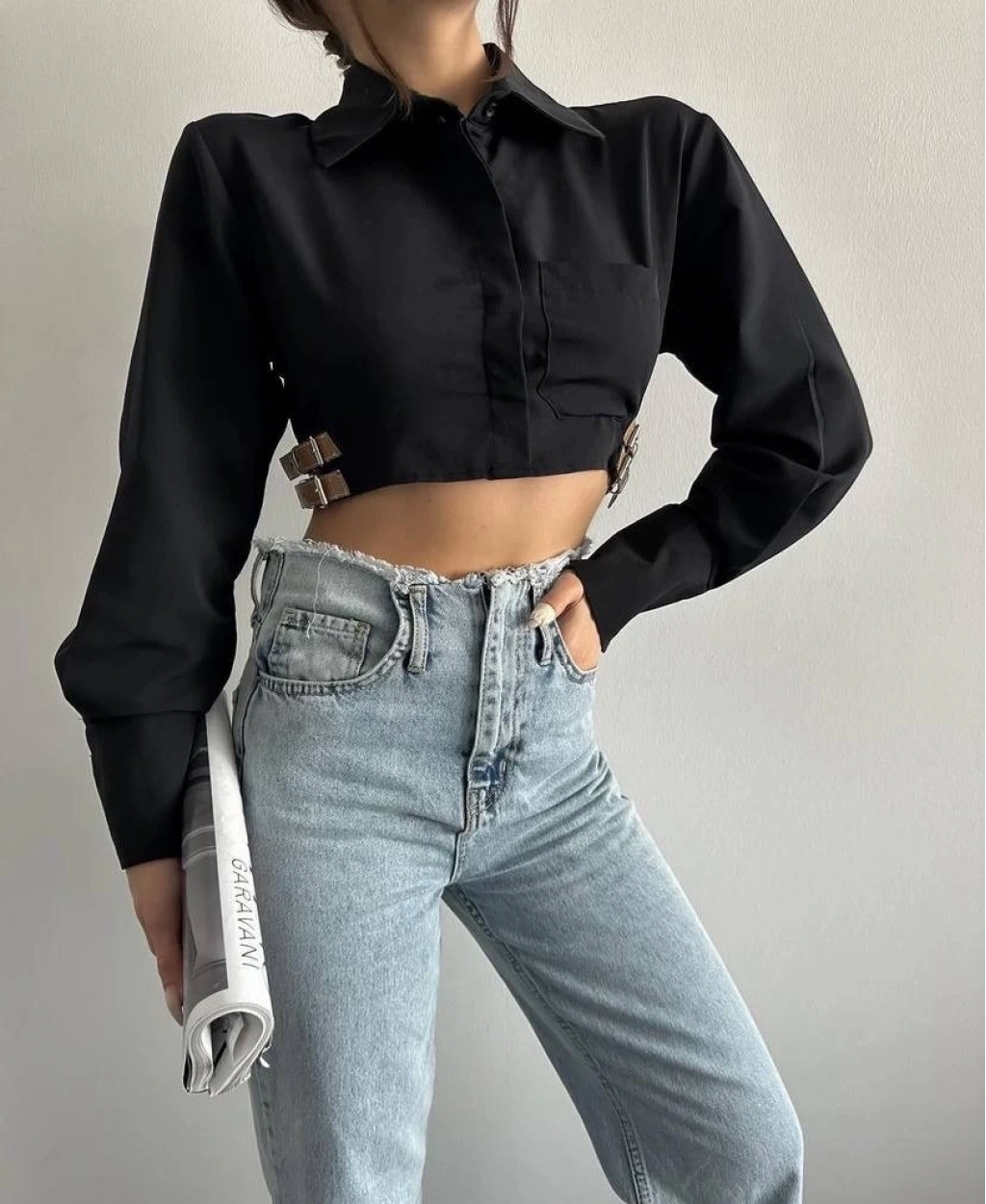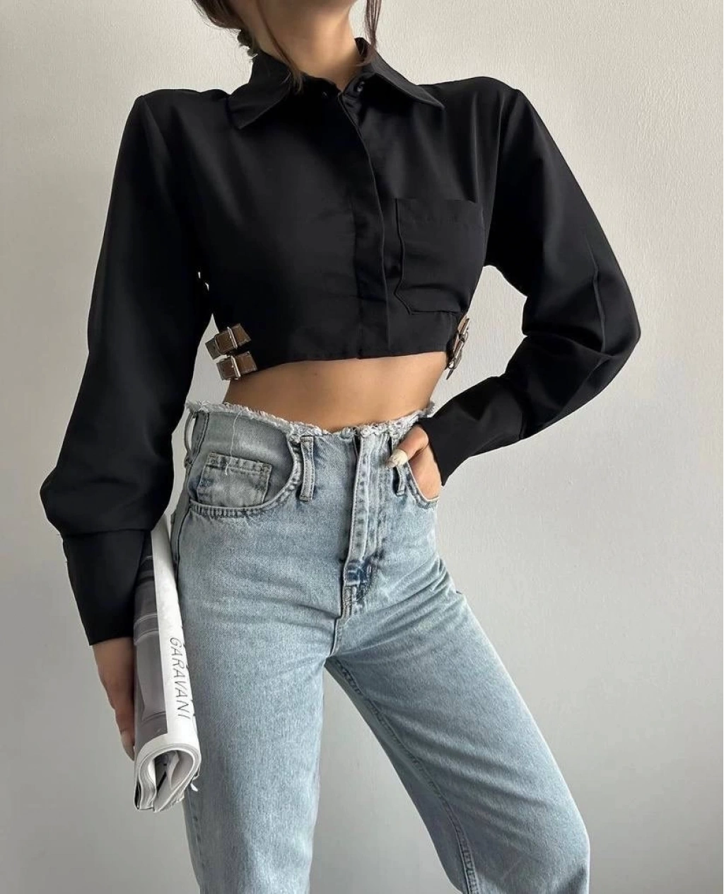 Yanı Kemer Detaylı Crop Gömlek Siyah S4009 ile tarzınızı tamamlayın! Bu crop gömlek, şıklığı ve rahatlığı bir arada sunar.