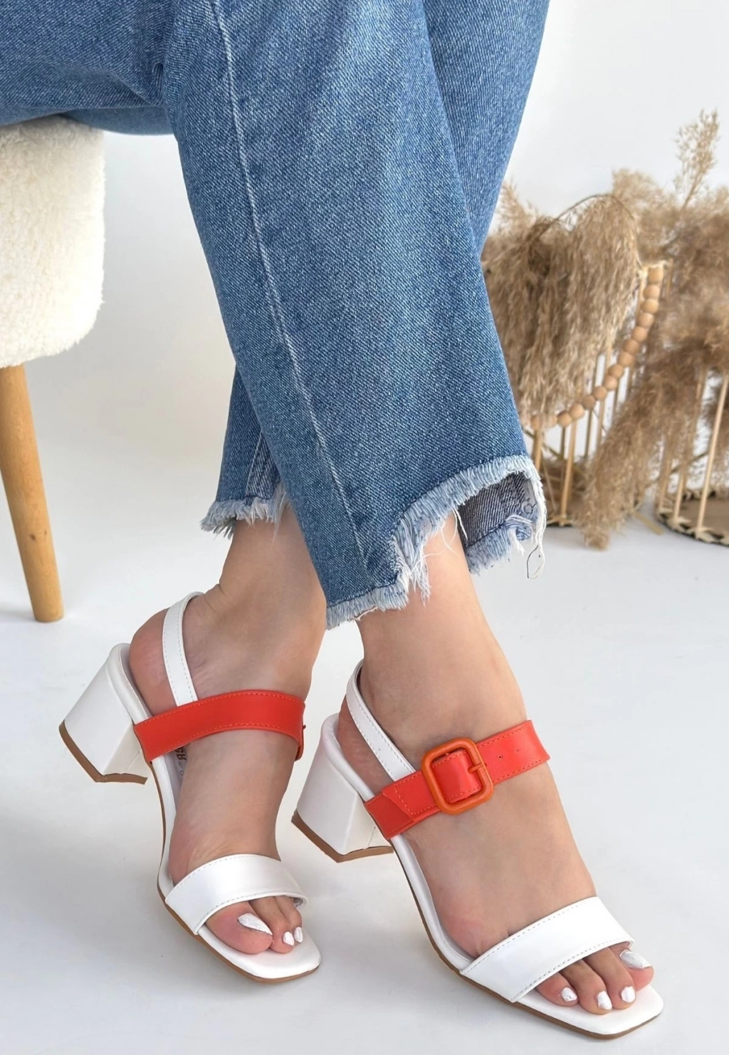 BİÇOMİ Year Beyaz Cilt Turuncu Detaylı Beyaz Topuklu Ayakkabı