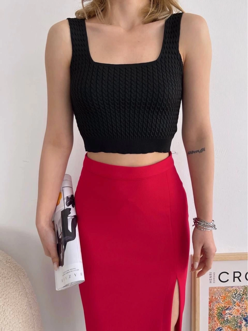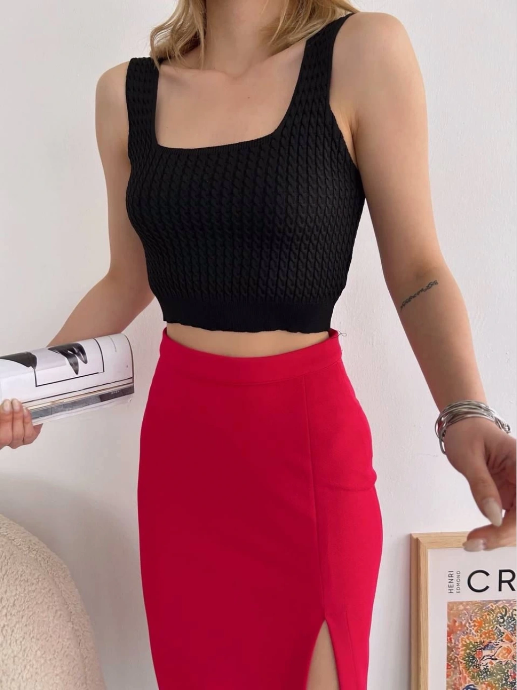 Bu yırtmaçlı midi boy eteği, sneakerlarla ve basic tişörtlerle kombinleyerek günlük şıklığınızı tamamlayabilir veya topuklu ayakkabılarla ve bluzlarla kombine ederek özel davetlerde fark yaratabilirsiniz.