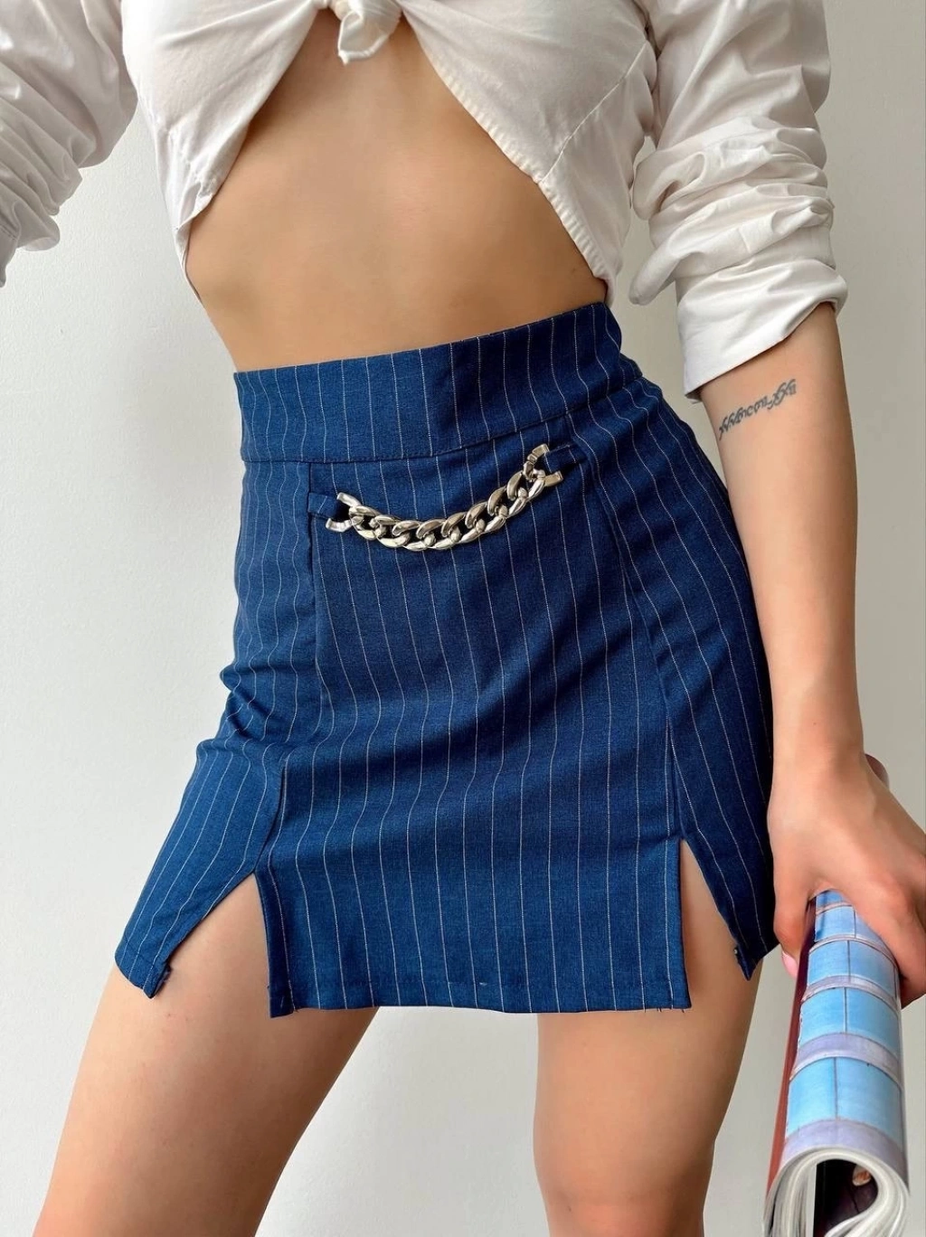 KAZAX marka zincir detaylı çizgili şort etek, şıklık ve rahatlık arayan kadınların tercihi.