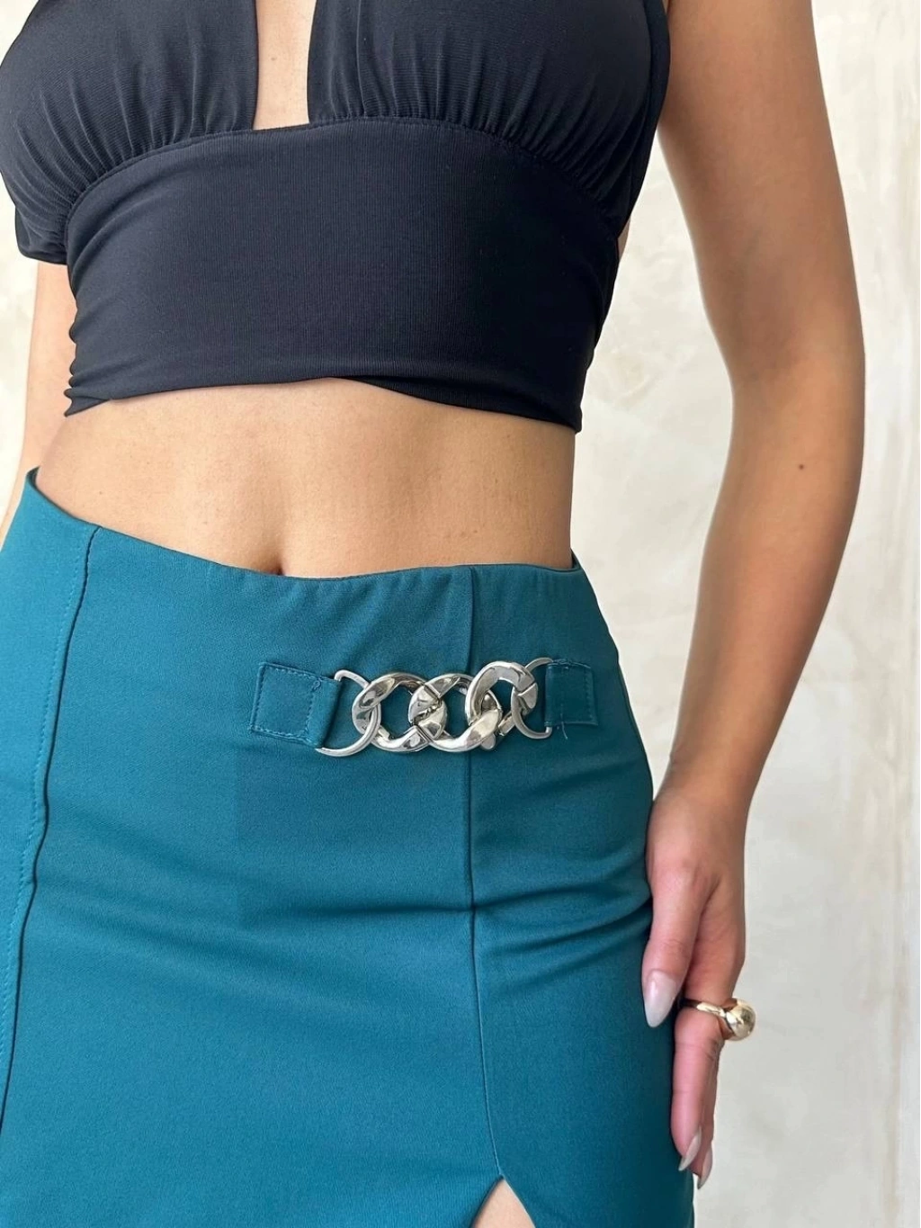 Sezonun trend parçalarından Zincirli Şort Etek S24676, şıklığı ve rahatlığı bir arada sunuyor.