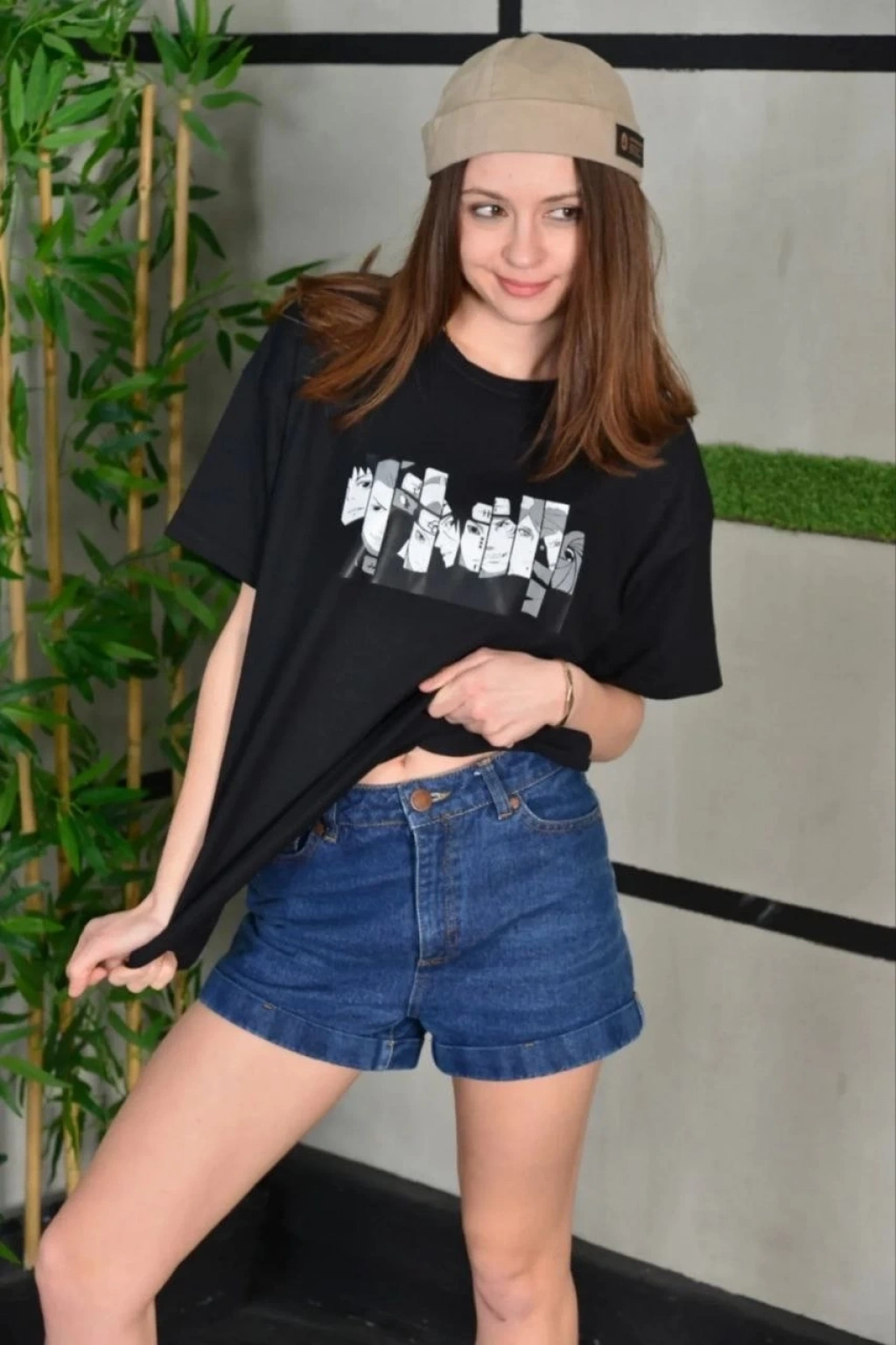 Kadın Baskılı T-Shirt Oversize Kısa kol Bisiklet yaka tişort- Siyah