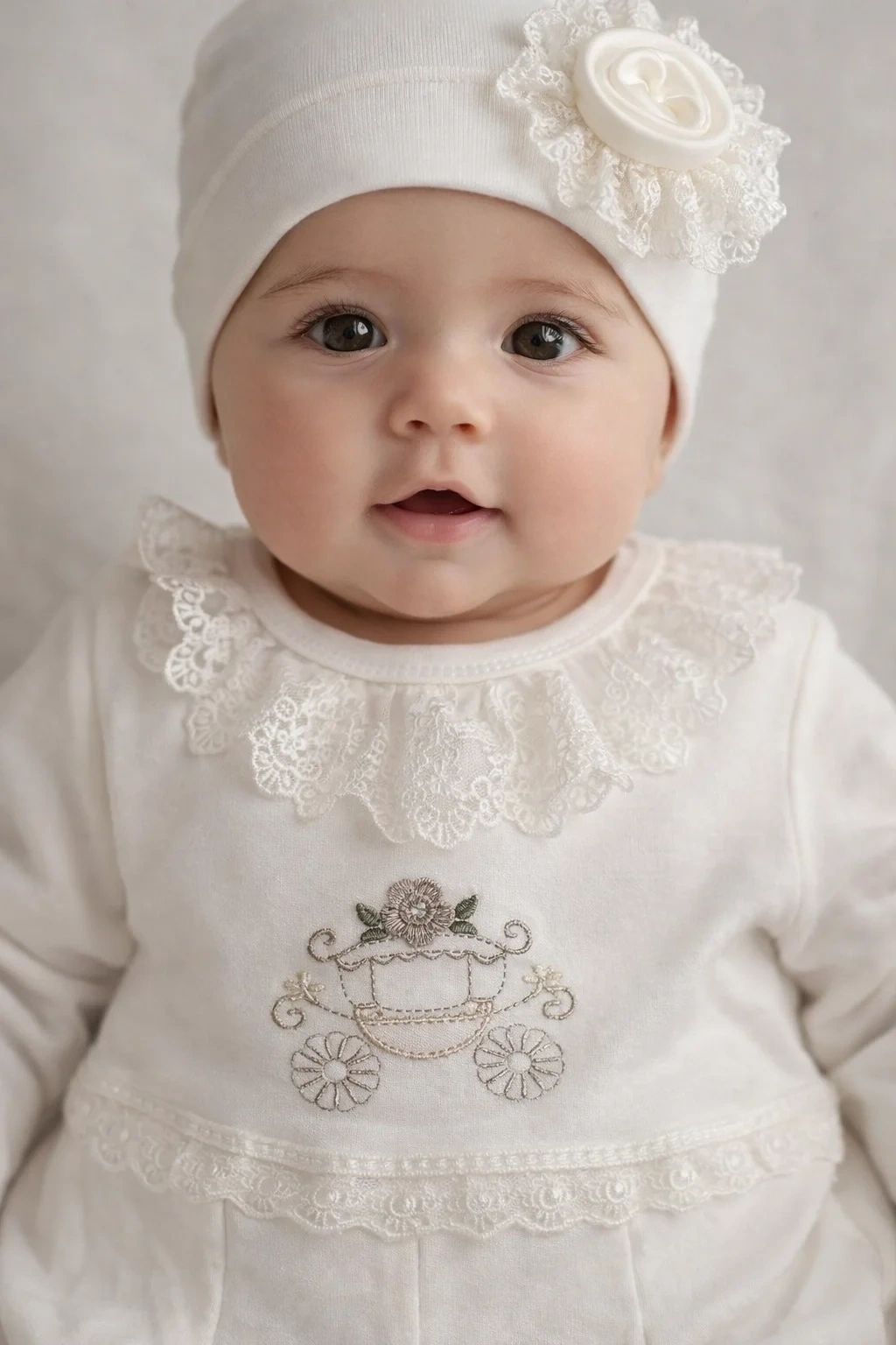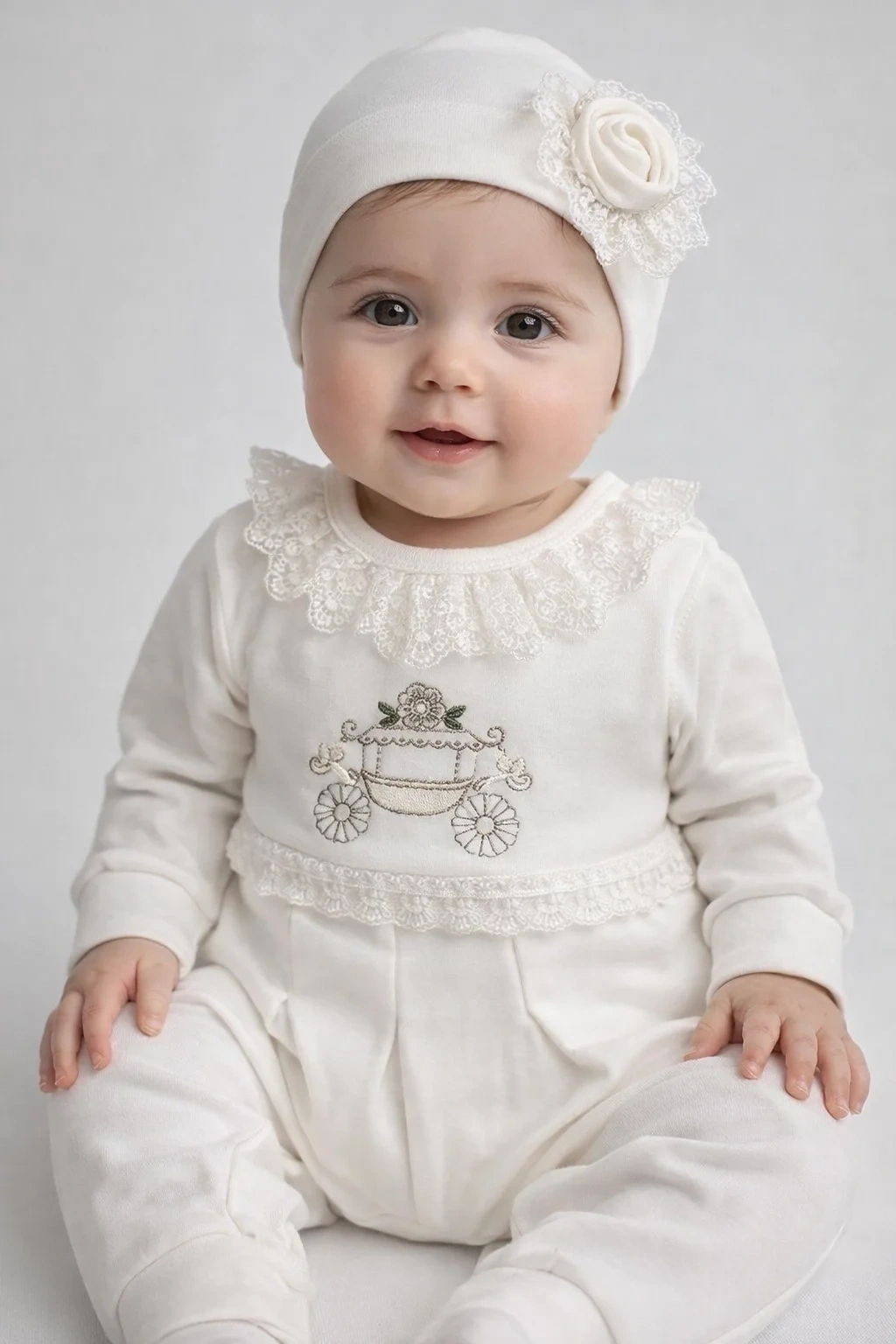 Bebeğinizin şıklığını ve konforunu bir arada sunan Çiçekli Araba Nakışlı Dantelli Kız Bebek Tulum ve Bere Seti, zarif tasarımıyla öne çıkar. Özenle işlenmiş çiçekli araba nakışı ve dantel yaka detayı, ürüne hem sevimli hem de premium bir görünüm kazandırır.