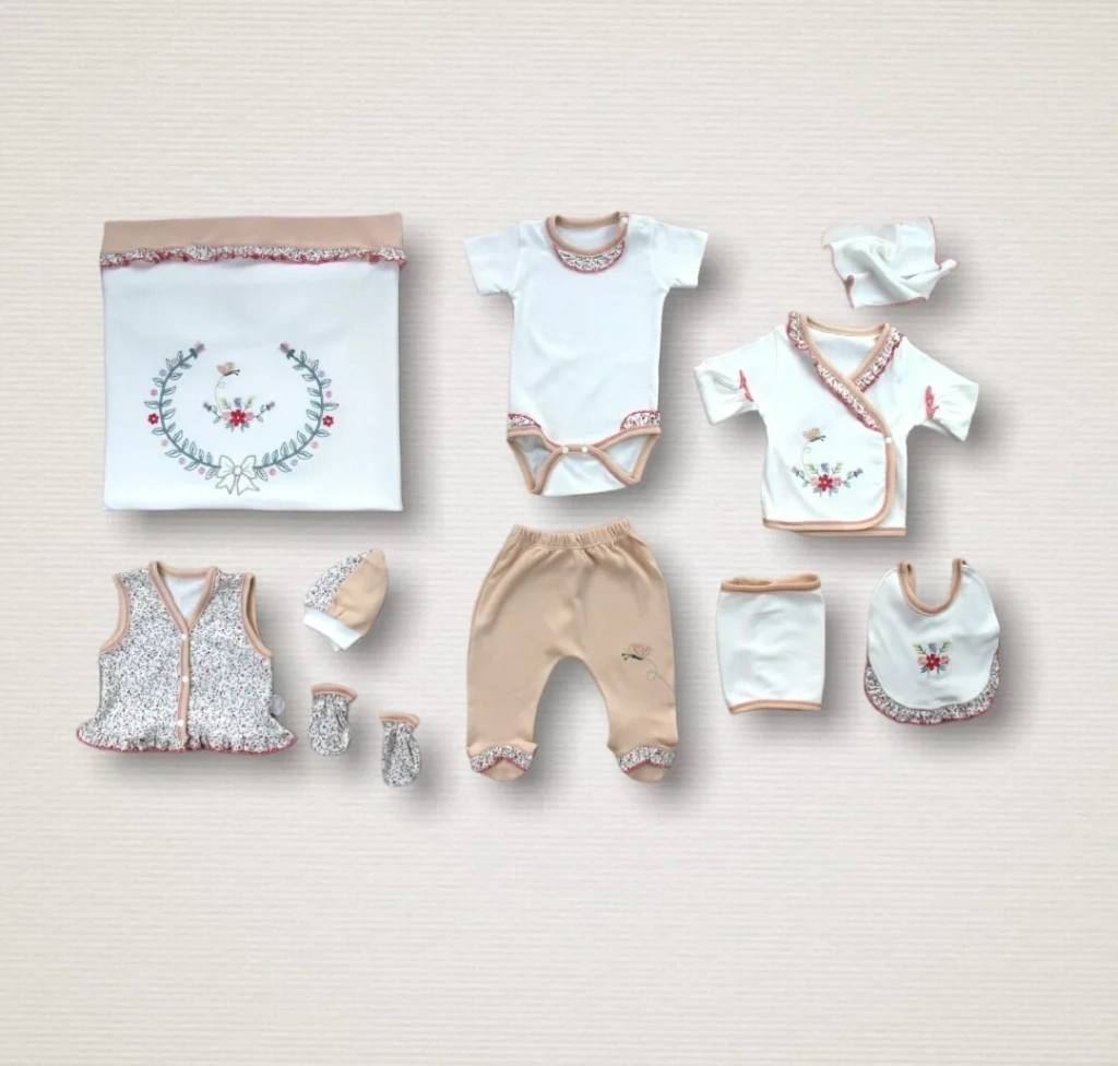 Erguvan Taç Nakışlı Kız Bebek 10lu Zıbın Takımı Hastane Çıkışı Nar Çiçeği