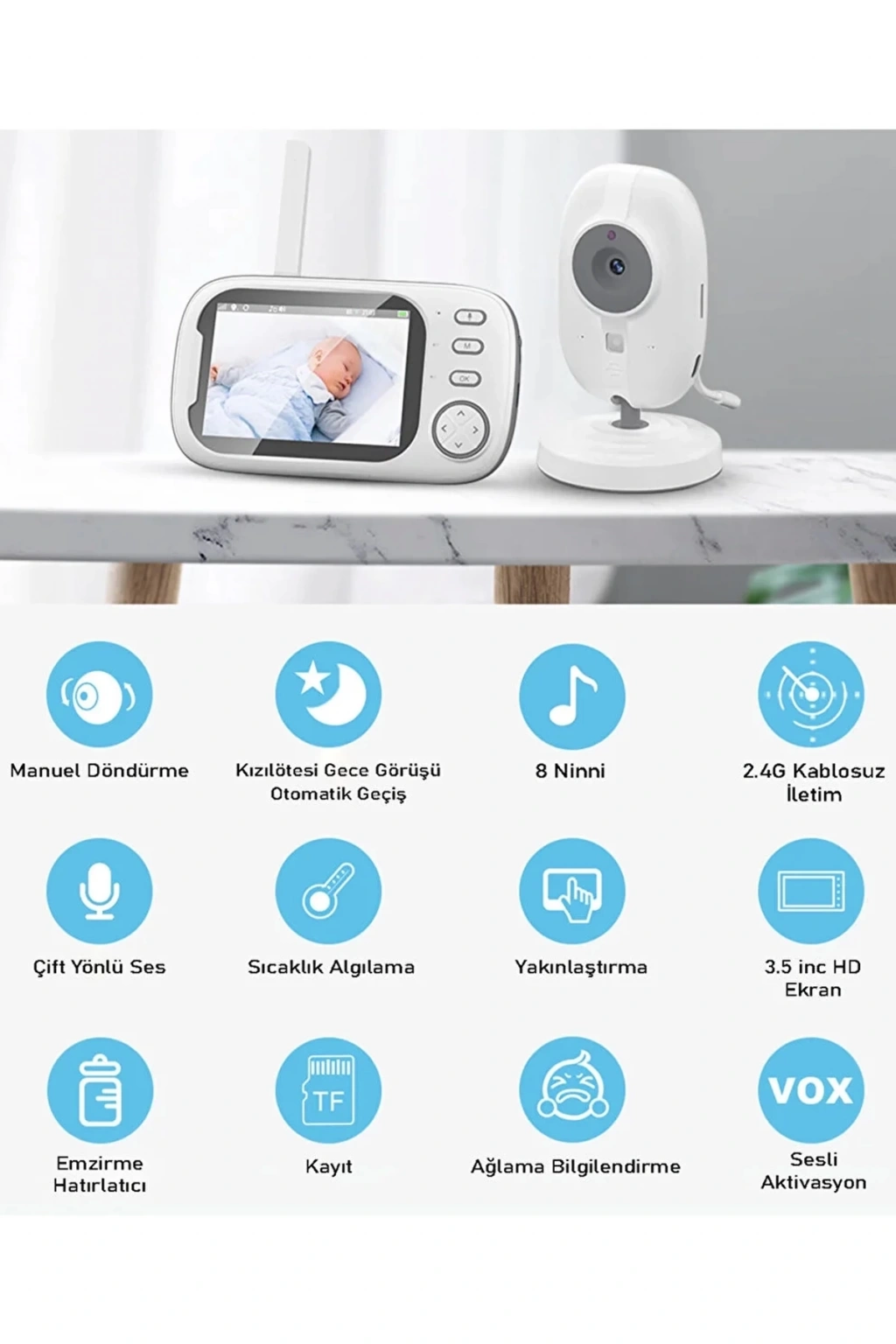 Kızılötesi gece görüş özelliği ile en karanlık ortamlarda bile en iyi görüntüyle bebeğinizi takip edin. Ağladığında devreye giren sensor sayesinde istediğiniz zaman güvenliğini sağlayabilirsiniz. Çift yönlü ses görüşmesi sayesinde çocuğunuza komut verebilirsiniz. Oda sıcaklığını istediğiniz seviyede tutmak için uyarıcı özelliğini aktif edebilirsiniz. Tüm görüntüleri kartınıza kaydedip daha sonra tekrar izleyebilirsiniz.