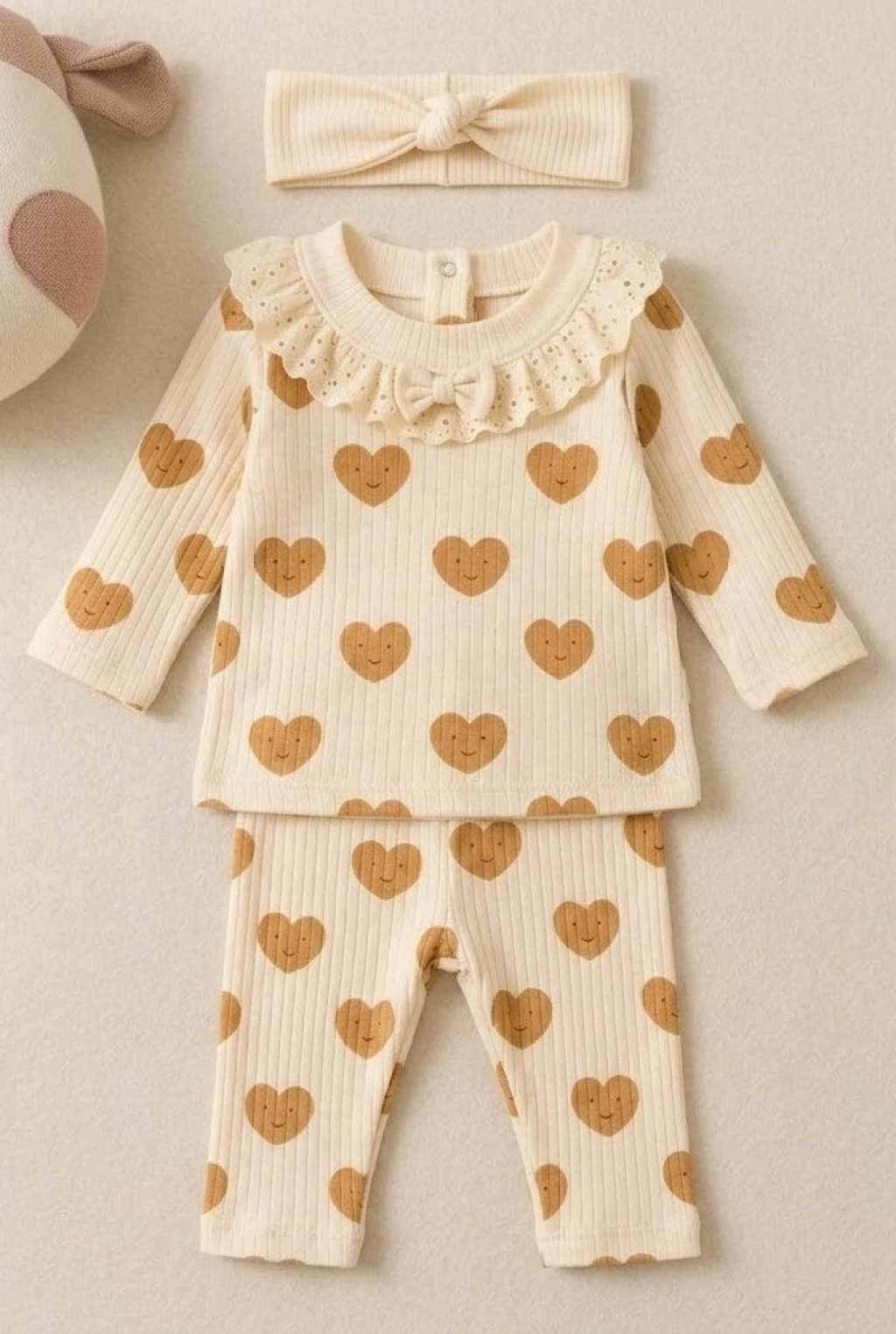 Kalp Baskılı Fisto Yaka 3 Parça Kız Bebek Takımı - %100 Pamuk