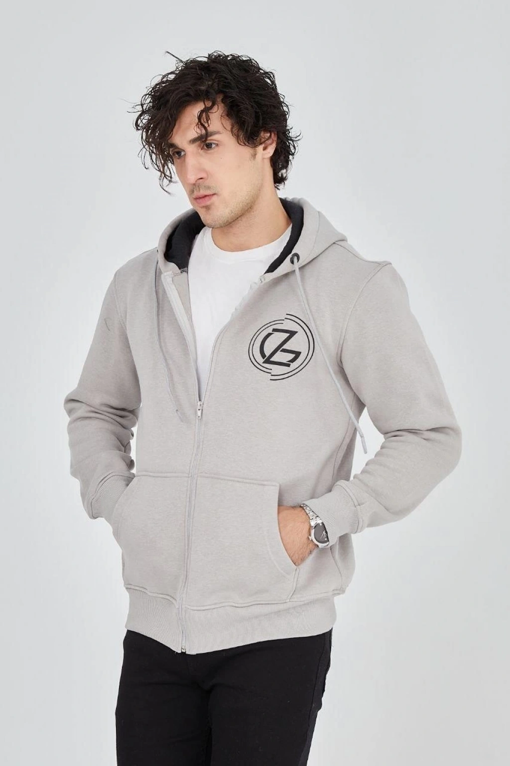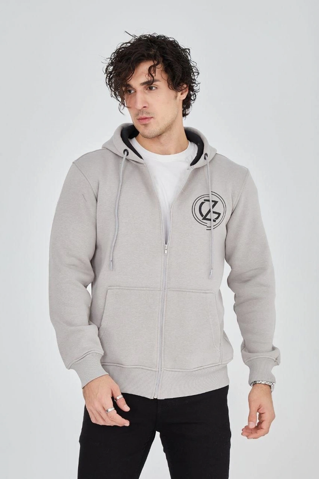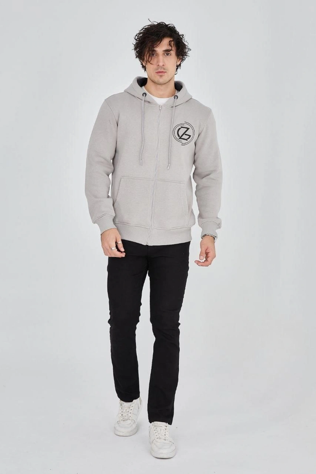 Kapüşonlu Baskılı Fermuarlı Hırka - Boyalı Gri