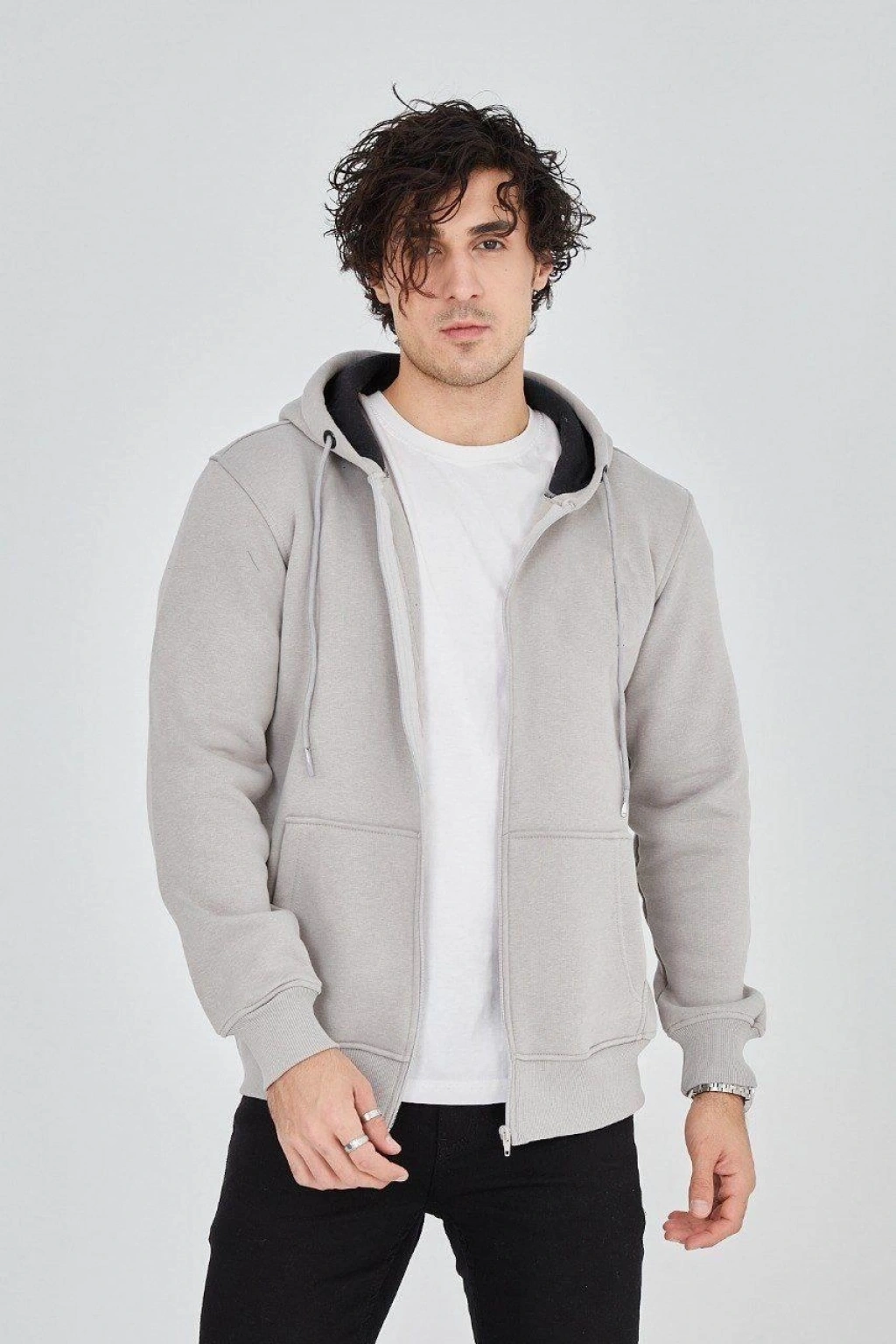 Kapüşonlu Düz Fermuarlı Hırka - Boyalı Gri