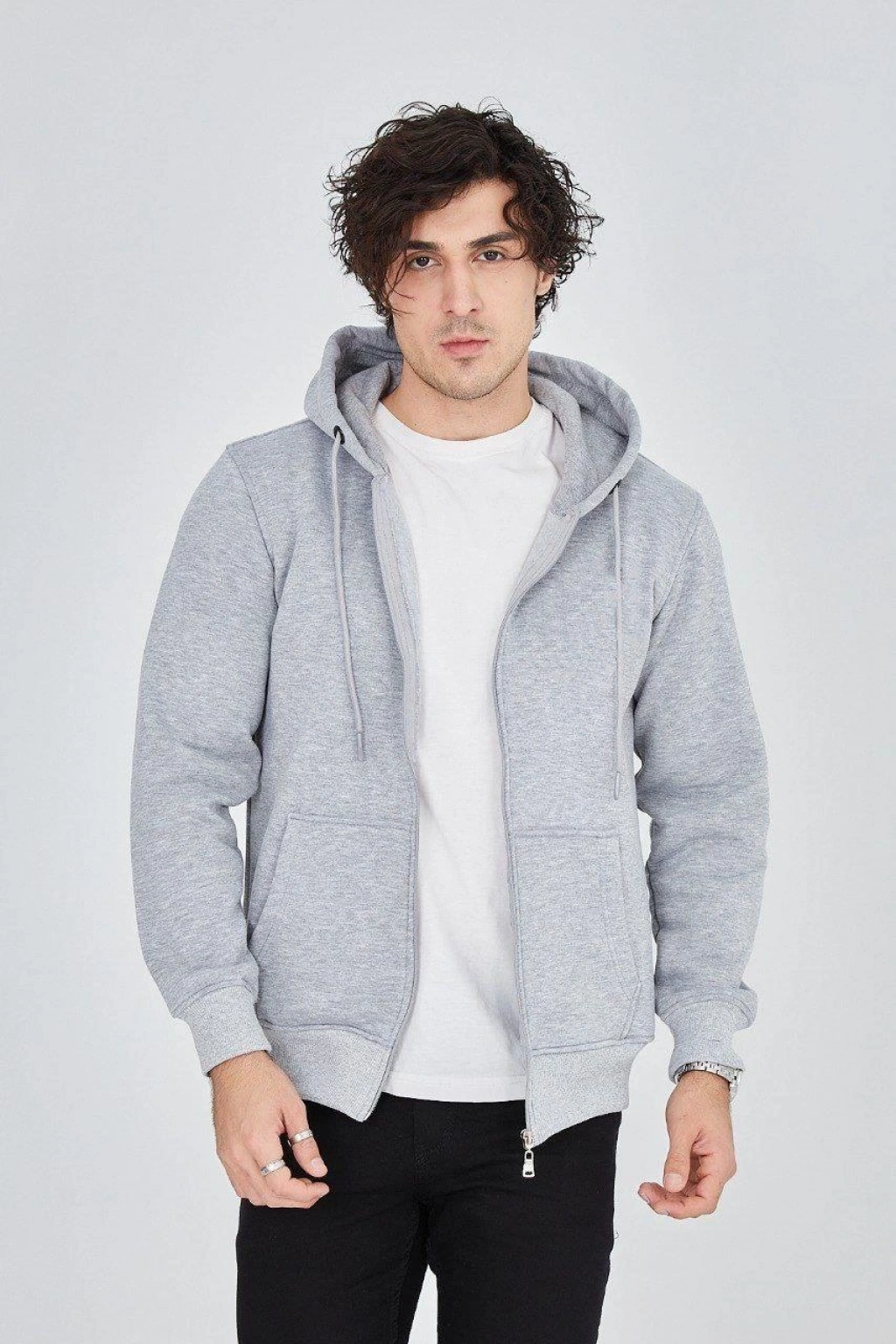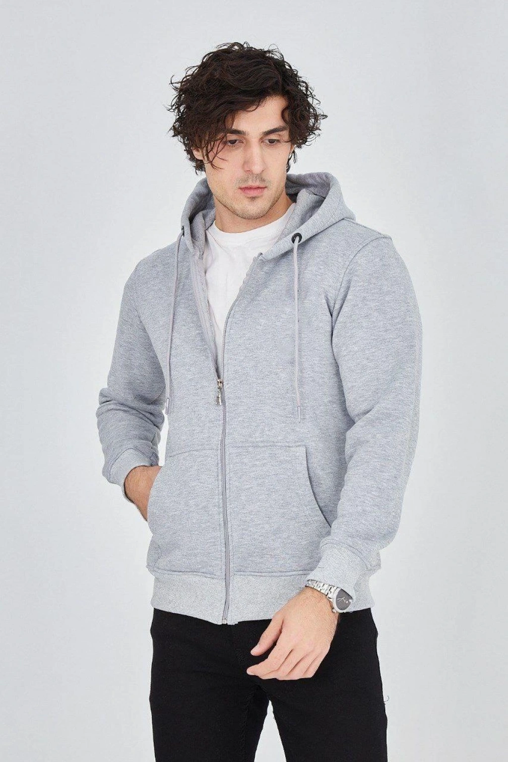 Kapüşonlu Düz Fermuarlı Hırka - Gri