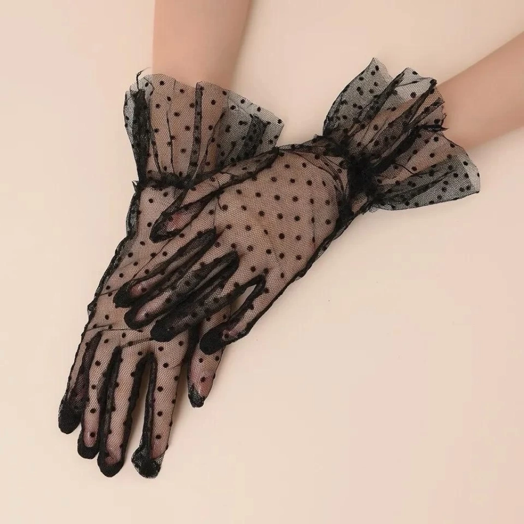Kısa Boy Güpürlü Siyah Puantiyeli Tül Eldiven Siyah Renk