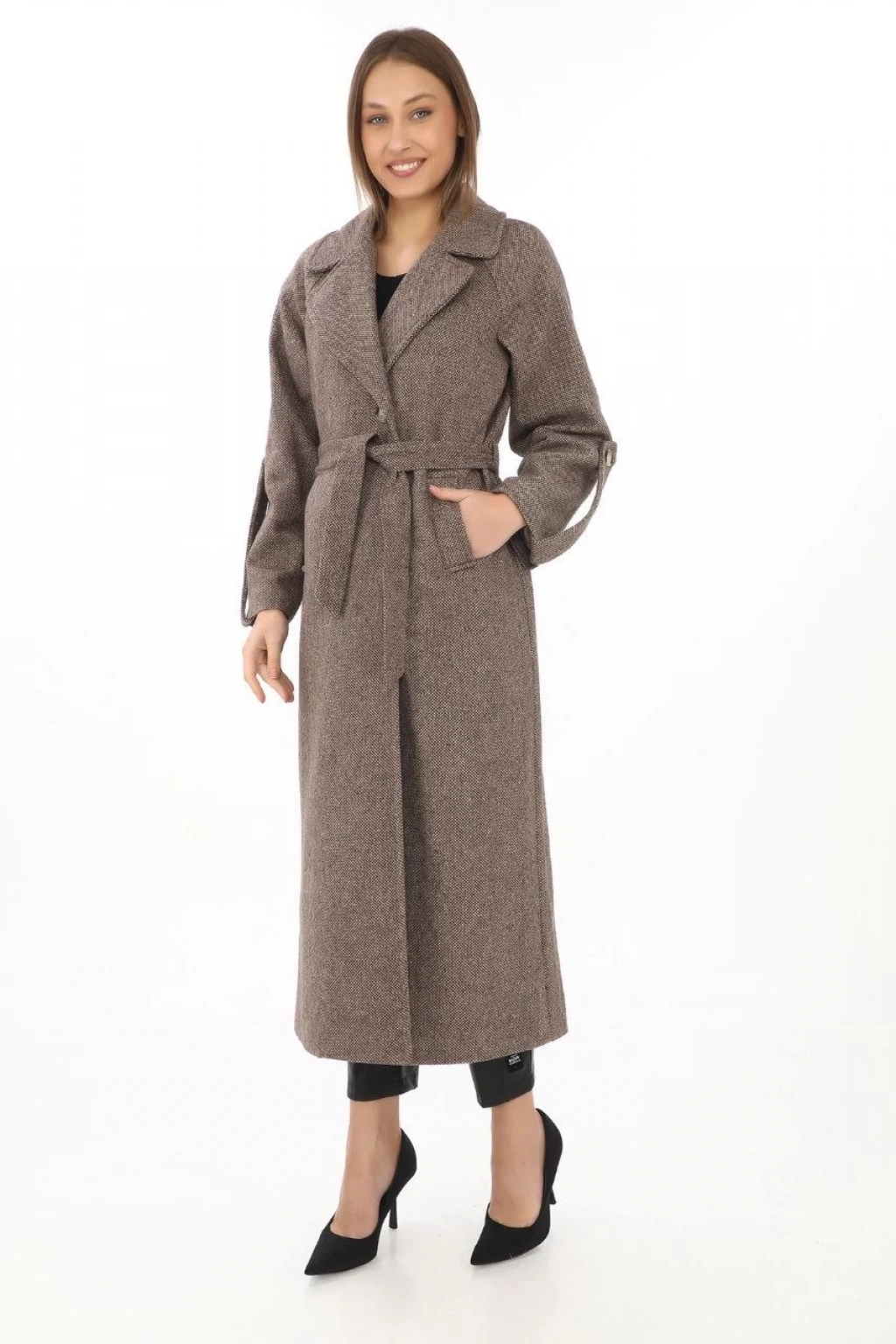 Beli Kuşaklı Yünlü Dokuma Kaşmir Kaban - Vizon