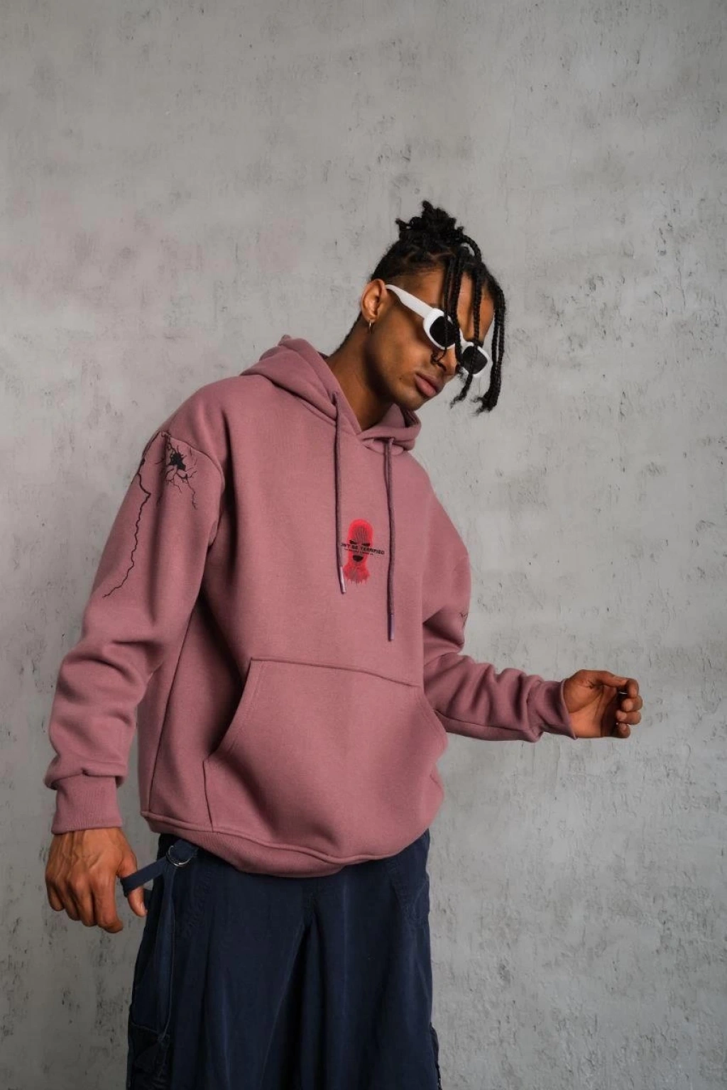 Maske Baskılı Kapüşonlu Sweat - Gül Kurusu