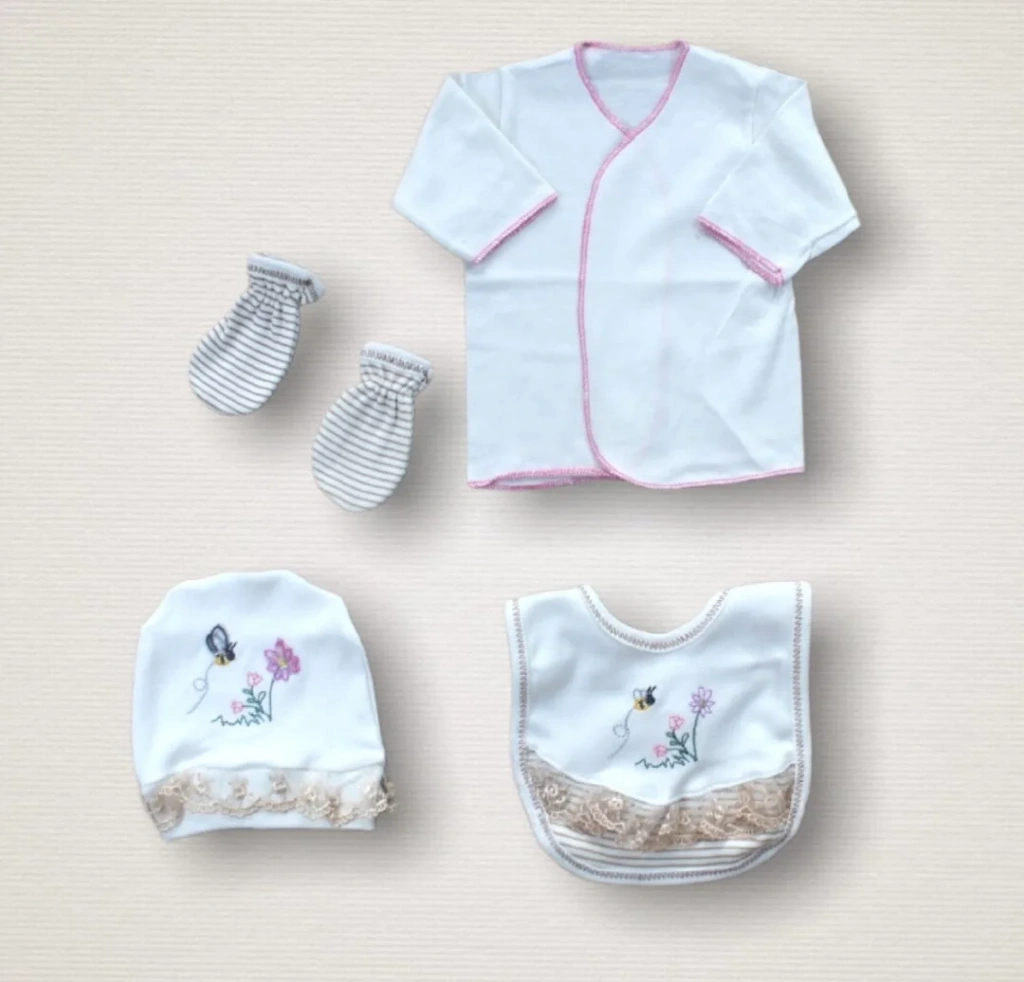 İleri nakış teknolojisi ile tasarlanmıştır. Üzerinde kullanılan çıtçıt bebek tenine temas etmemektedir. Ürünlerimizde polyester iplik kesinlikle kullanılmaz. Kullanılan ipler pamuklu veya viskon karışımlı iplerdir. Ürünlerimizin kol birleştirme, yaka birleştirme, pantolon ağ birleştirme vb. yerlerinde ki dikişler de, ürünün kullanımı esnasında, zorlanarak zarar görmesini engellemek amacıyla belirtilen kısımlarda, ekstra güçlendirilmiş dikiş şekli olan ÇİMA dikişi uygulanması şarttır. Ürünlerimizde, beden etiket numarası ve yıkama talimatı bilgilerinin ürün ensesine, ense baskısı şeklinde ve ekolojik boyalar ile boya baskı olarak uygulanmaktadır. Ürünlerimizde kullanılan çıtçıtlar nikel free sertifikalı, ekstra kaliteli çıtçıtlardır. Çıtçıt ve düğme yerleri (detayları), bebek yatarken kesinlikle bebeğe zarar vermeyecek yerlere gelecek şekilde tasarlanmıştır. Ürünlerimizde, fermuar vb. aksesuarlar uluslararası standartlarda, anne ve bebek sağlığına zarar vermeyecek şekildeki sertifikalı markalardan ve modellerden kullanılır. Ürünlerimizde, bebeğin tenine temas eden yüzeylerde, nakış arkası vb. riskli yüzeylerde ve bebeğin tenini tahriş etme olasılığı olan tüm detaylarda mutlaka tela vb. yapıştırılarak, bebeğin zarar görmesini engelleyecek gerekli önlemlerin alınması şarttır. Ürünlerimizde kullandığımız kumaş, tül, dantel vb. malzemelerin tamamının antialerjik ve özelliklerde ki malzemelerden üretilmiş olması şarttır.