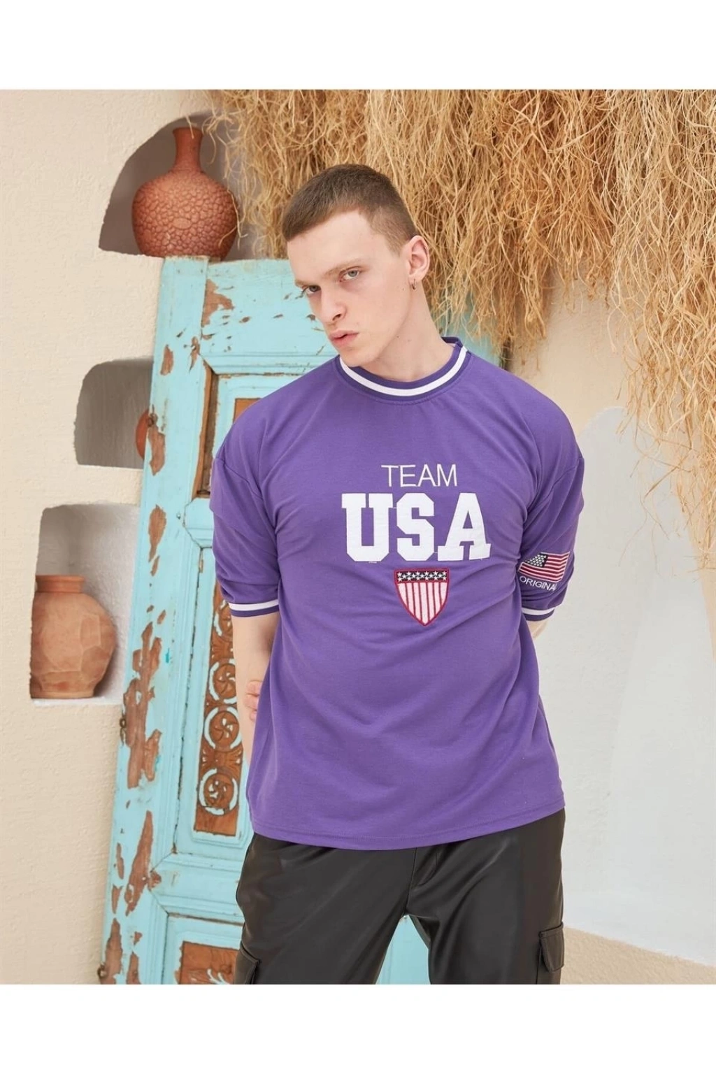 Nakış İşlemeli Ribanalı Oversize T-shirt - Mor