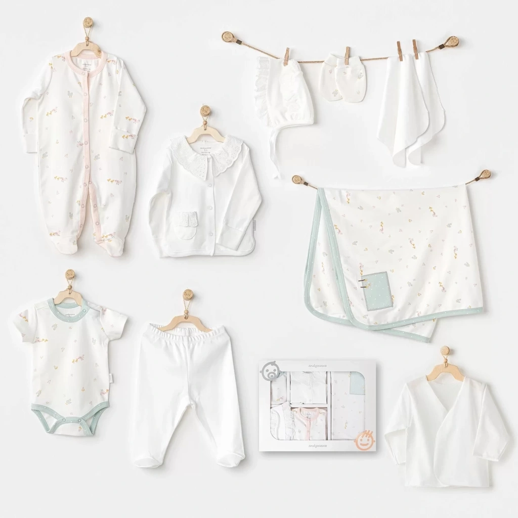 Ürünlerimiz bebeğinizin sağlığı düşünülerek birinci sınıf ham maddelerden üretilmiştir. Bebeğiniz için zararlı kimyasallar içermez. Azo-Free boya ve Nikel- Free aksesuarları ile uluslararası üretim teknikleri ve güvenlik standartlarına sahiptir. Benzer renklerle birlikte yıkayınız. Yüksek kalite standartları Oeko-Tex belgesi ile tescillenmiştir. Kumaş Özellikleri: %100 Pamuk. Ürün İçeriği: 1 adet tulum. 1 adet body. 1 adet iç zıbın. 1 adet dış zıbın. 1 adet patikli pantolon. 1 adet battaniye. 1 adet şapka. 1 adet eldiven. 2 adet ağız temizleme bezi. Yıkama Talimatları: 30°C sıcaklıkta yıkayınız. Çamaşır suyu kullanmayınız. Düşük sıcaklıkta ütüleyniz. Tambur kurutma yapılmaz.
